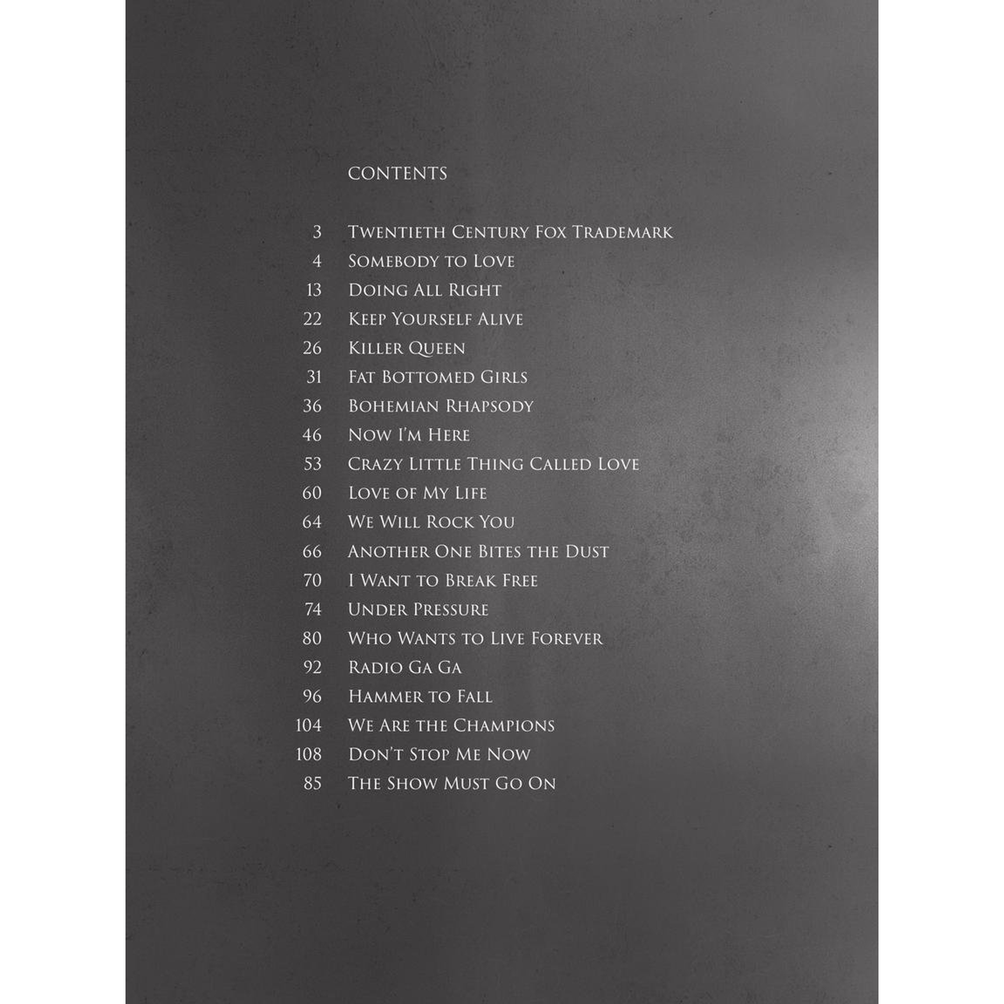 L'arrangiamento copre una vasta selezione di titoli noti: oltre al leggendario brano principale troverai hit rock e pop come "Another One Bites The Dust", "Crazy Little Thing Called Love", "Killer Queen", "We Will Rock You", "Under Pressure" e molti altri. Ne risulta un repertorio versatile per pianoforte solo, voce con accompagnamento o accompagnamento di chitarra - perfetto per l'esercizio, le esibizioni o la sala prove della band.