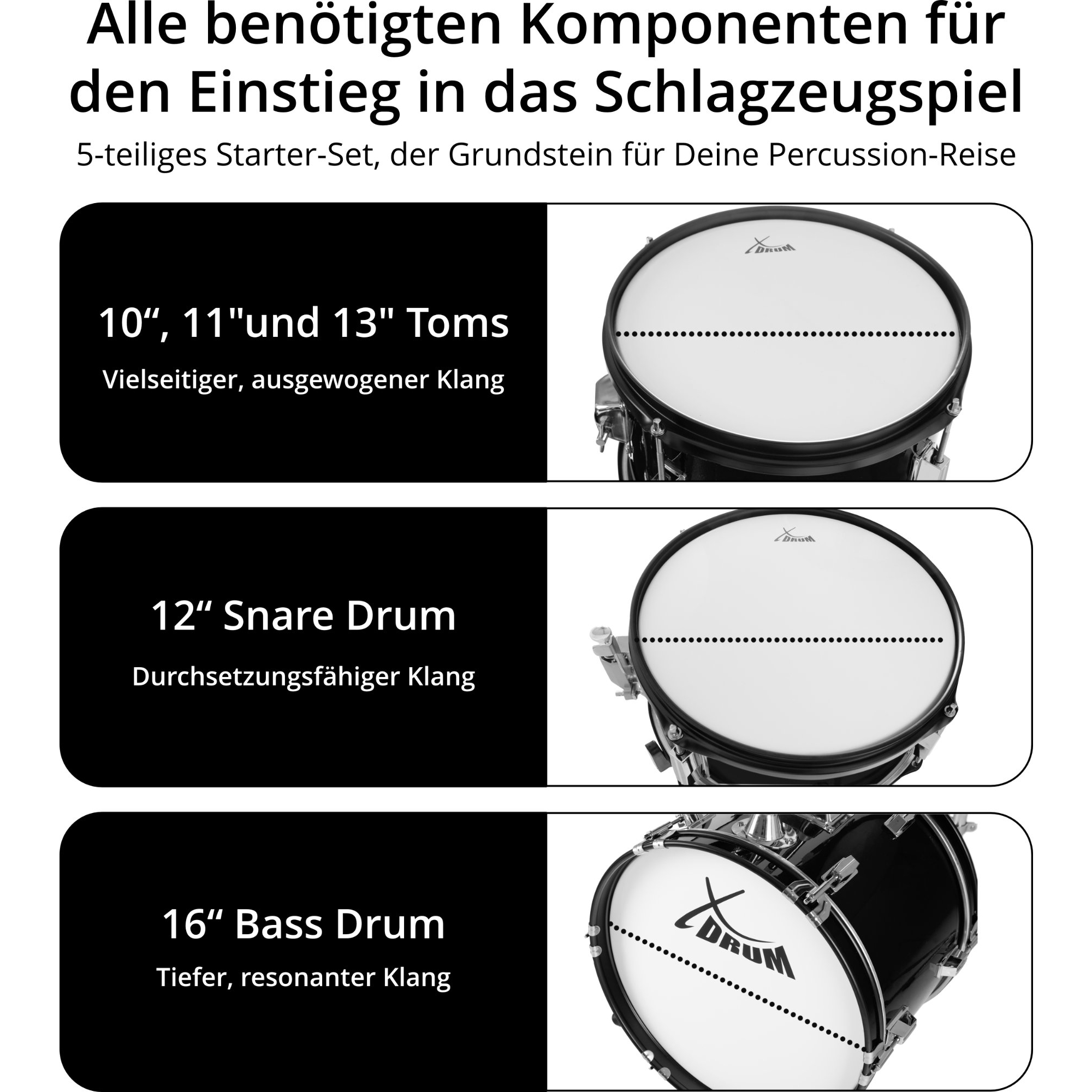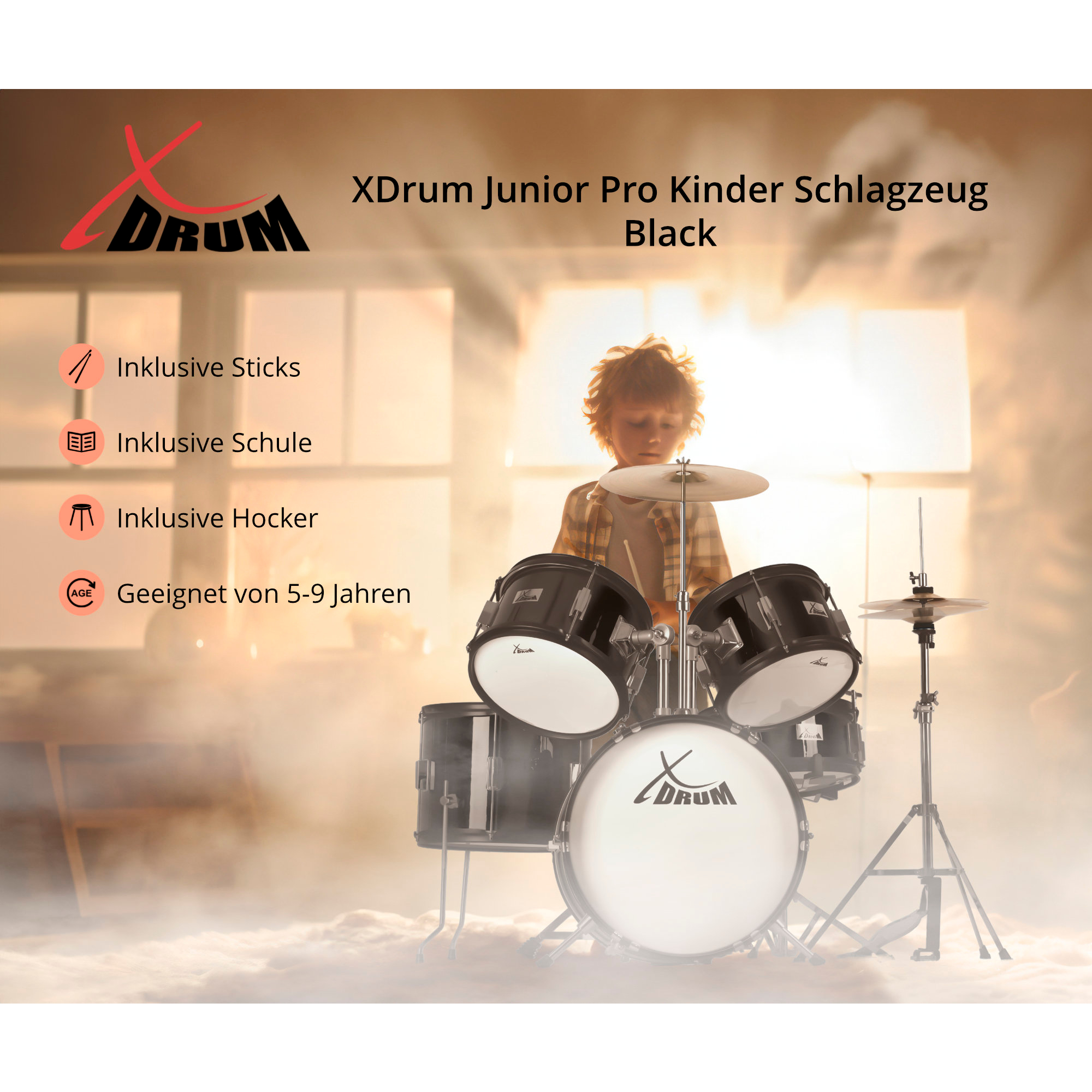 Das XDrum Junior Pro ist das ideale Schlagzeug für Kinder, die erste Schritte im Bereich der Musik unternehmen wollen. Es bietet ein unschlagbares Preis- / Leistungsverhältnis und eine qualitativ hochwertige Verarbeitung, wie man sie bei Kinder-Schlagzeugen nur selten findet. Der Kesselsatz ist wie bei "großen" Schlagzeugen sauber und sehr hochwertig verarbeitet. Im Lieferumfang ist bereits alles enthalten, was Dein Kind braucht, um sofort loslegen zu können.