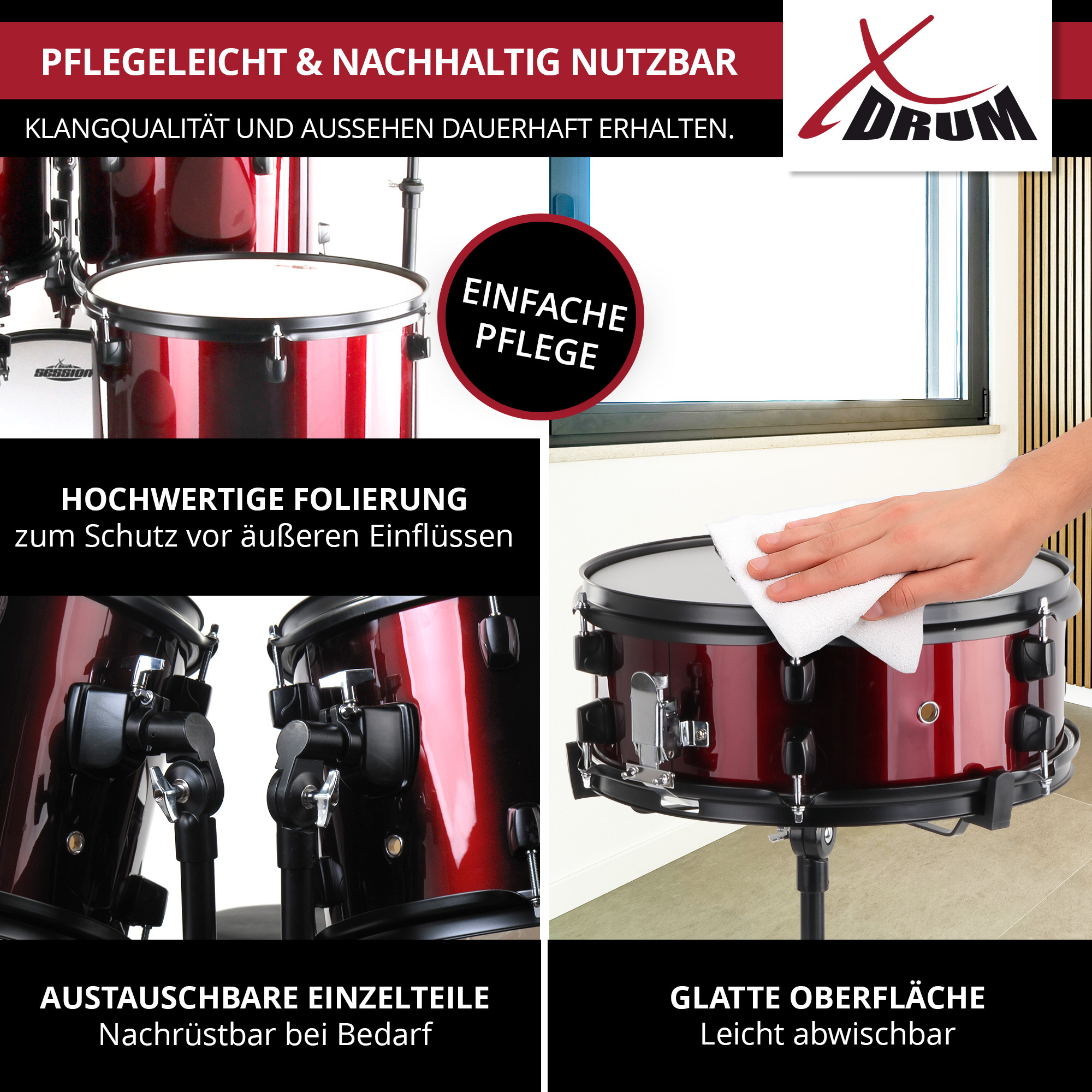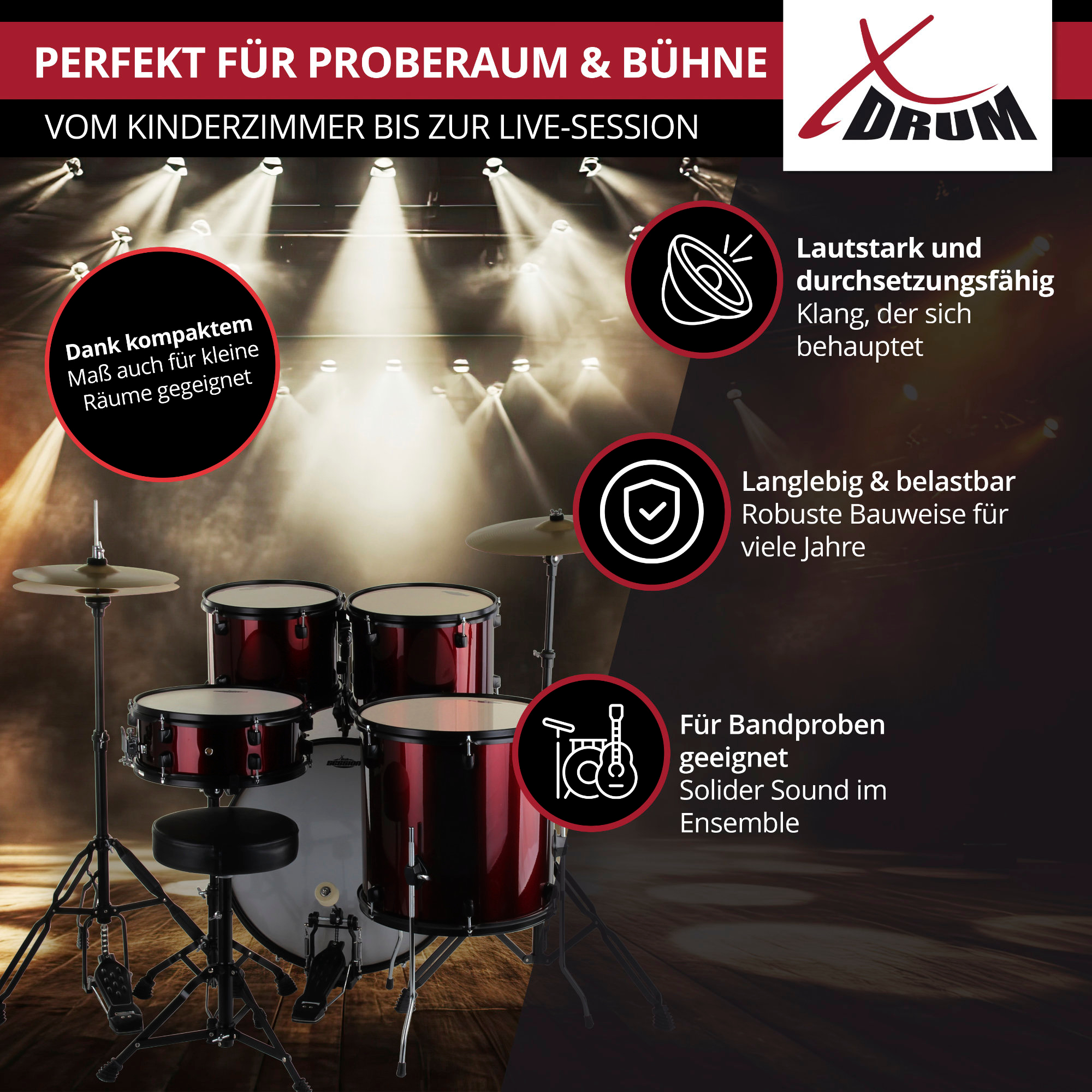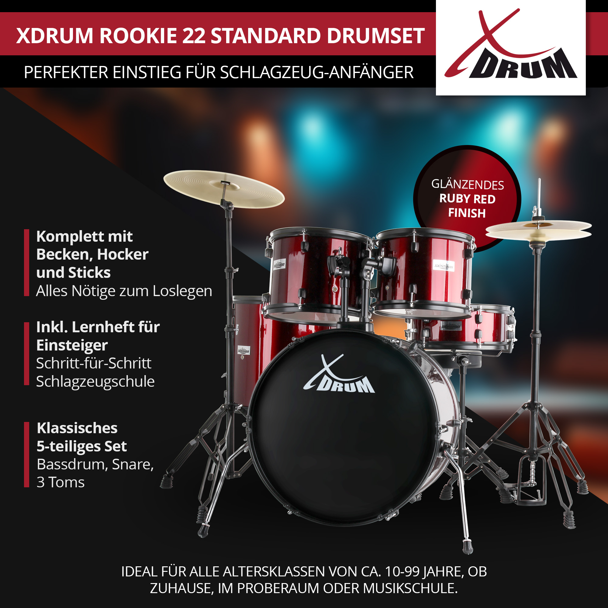 Um keine Wünsche offen zu lassen, bekommst Du das Set natürlich komplett mit den speziellen, leisen Übungsbecken mit geringem Sustain. Außerdem erhältst Du in dem Komplettset einen höhenverstellbaren Hocker, der es kleinen und großen Leuten gleichermaßen ermöglicht, bequem am Instrument zu sitzen, ein Paar Drumsticks und eine ausführliche Aufbauanleitung.