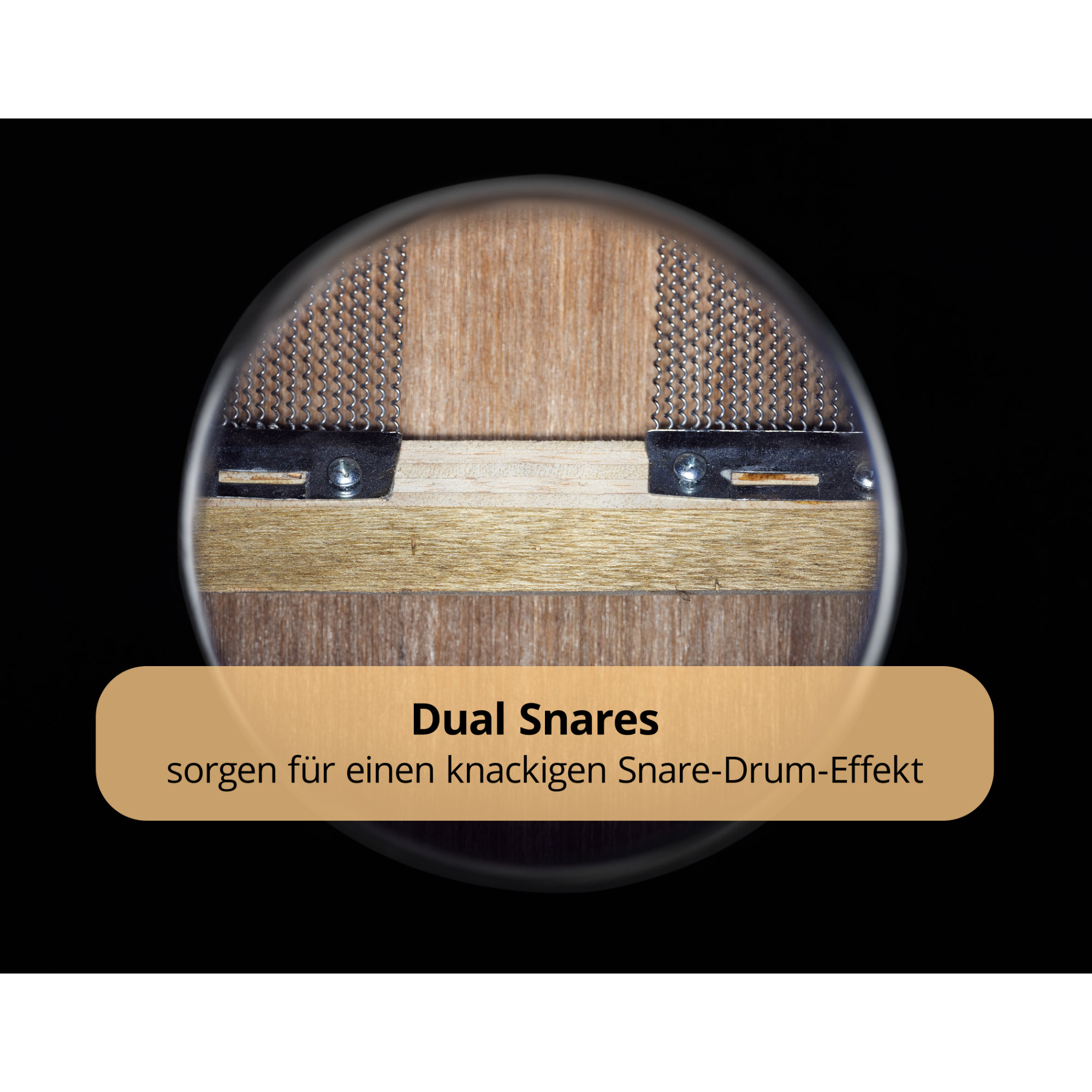 Um die Schläge an der Oberkante zu verfeinern, ist im Inneren ein 20-spiraliger Snareteppich angebracht, welcher beim Anschlagen der Cajon mitvibriert und somit für die typische Klangfärbung sorgt.