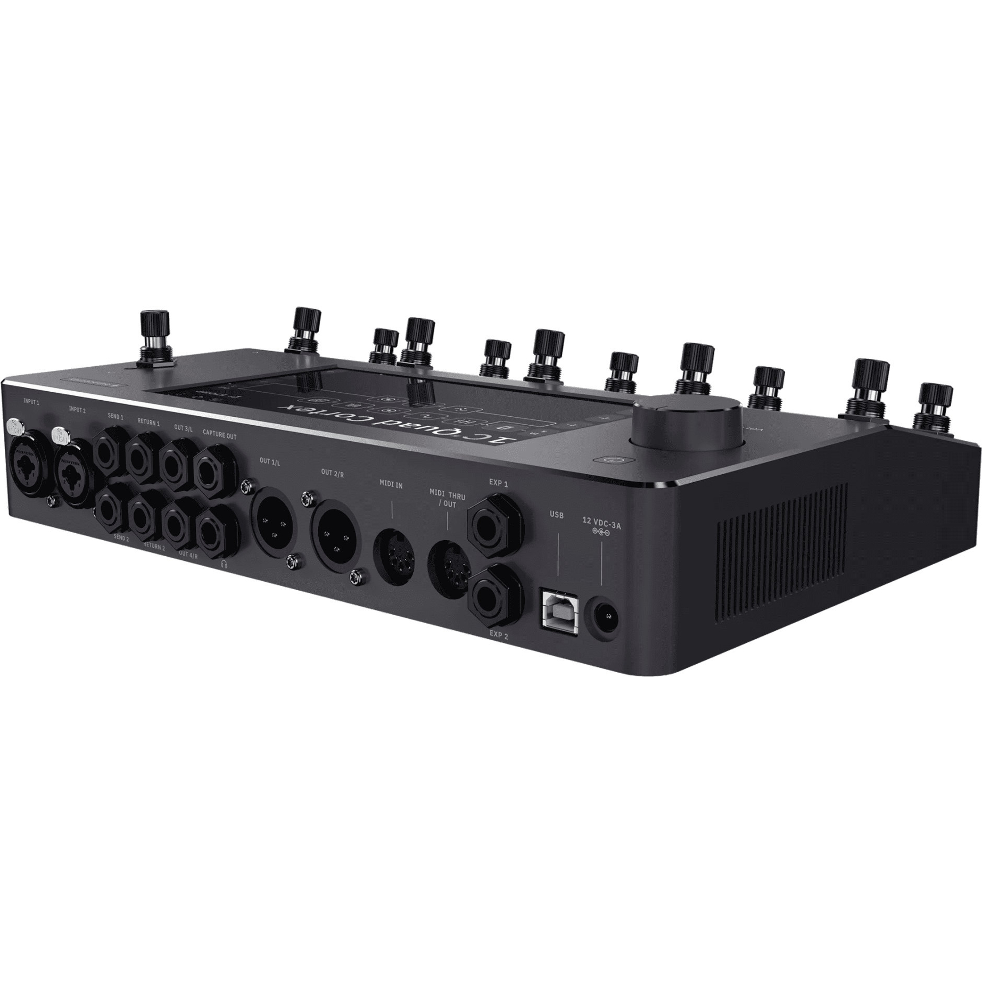 MIDI In, Out/Thru: Empfängt und sendet MIDI-Befehle, um das Schalten und Steuern aller Parameter im Quad Cortex zu automatisieren und andere Geräte zu steuern.