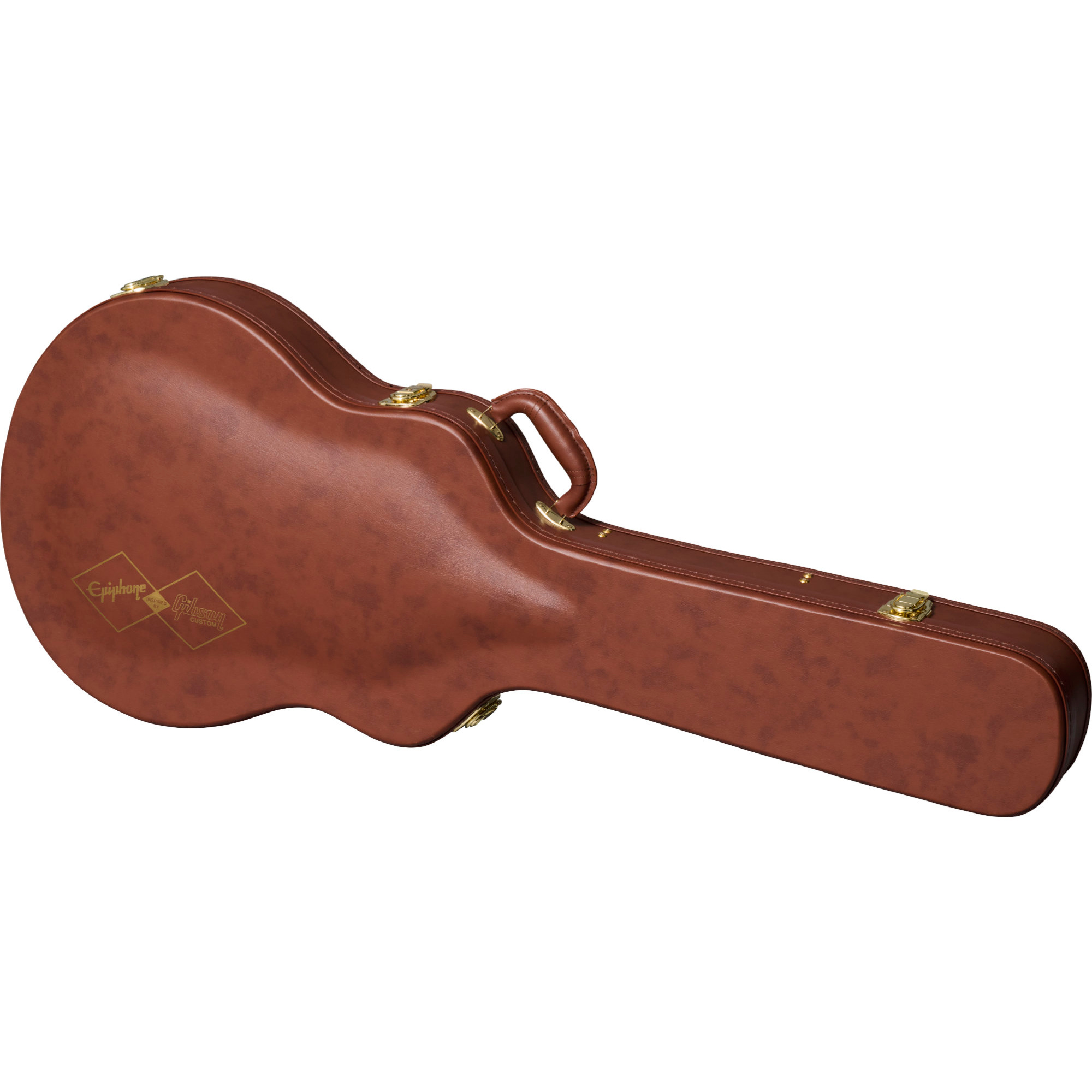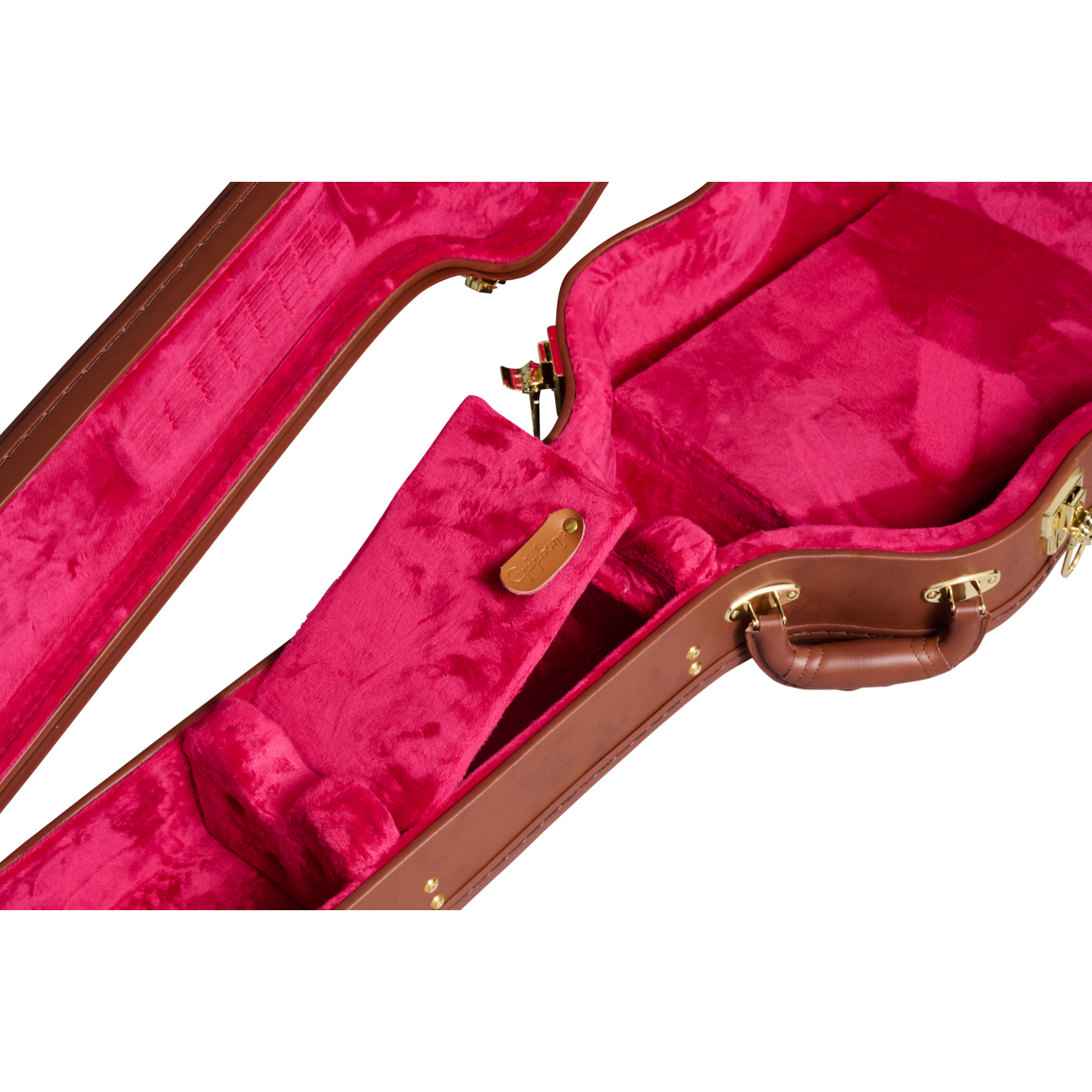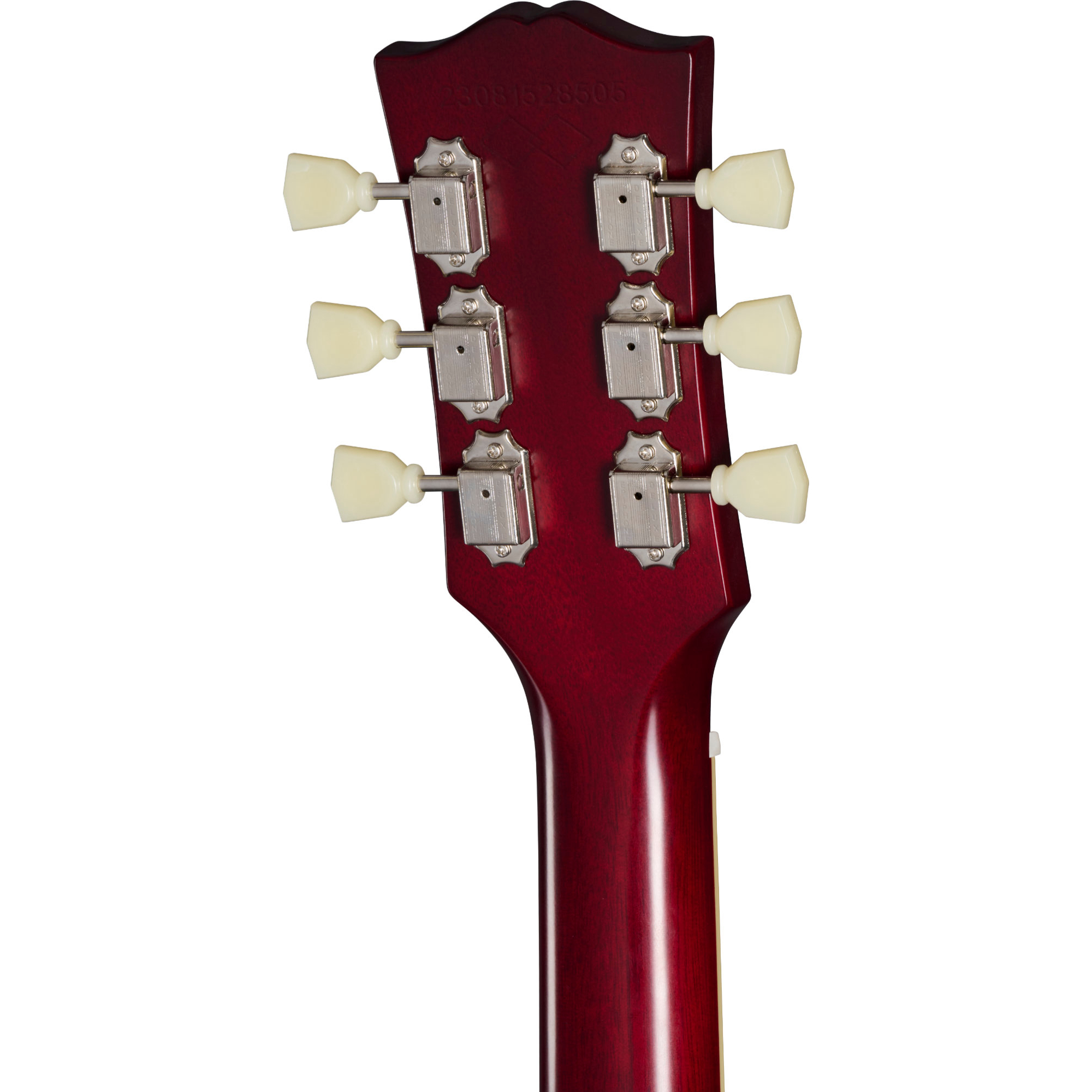 Sie verfügt über einen Mahagonikorpus mitAAA-Riegelahorn-Decke, einen einteiligen Mahagonihals mit einem bequemen, abgerundeten '59er Medium-C-Profil, einem langen Halszapfen und einer R9-Kopfplattenform im Gibson-"Open Book"-Stil, VOS-Lackierung (Vintage Original Sheen), Gibson Custombucker Humbucker-Tonabnehmer, Switchcraft-Wahlschalter und 1/4"-Ausgangsbuchse, CTS-Potis, 50er-Jahre-Verdrahtung, Mallory-Kondensatoren, nicht abgeschrägtes Schlagbrett, Epiphone Deluxe Vintage-Mechaniken mit Keystone-Knöpfen und ein braun-rosa Hartschalenkoffer im Vintage-Stil.