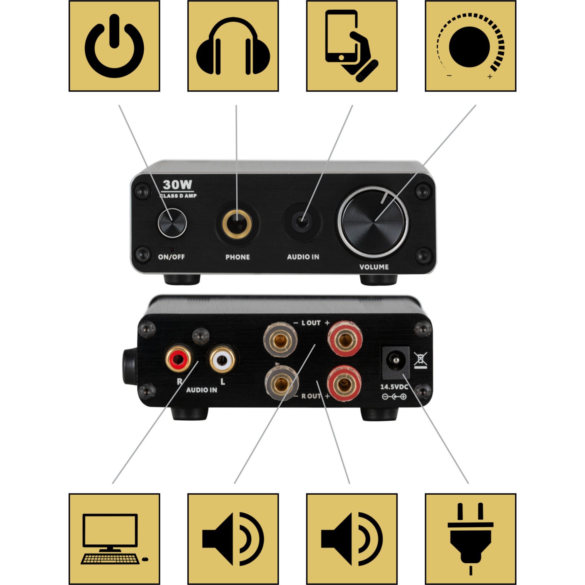 An Lautsprechern mit 4 Ohm Widerstand angeschlossen liefert der kleine Amp mit Class-D Endstufe 30 Watt Leistung, und somit ausreichend Lautstärke, um heimische Wohnbereiche oder Gasträume zu beschallen. An Lautsprechern mit 8 Ohm Impedanz werden 8 Watt je Kanal erzeugt. Der hohe Wirkungsgrad von über 90% macht sich sowohl im Energieverbrauch als auch in der Wärmeentwicklung positiv bemerkbar.