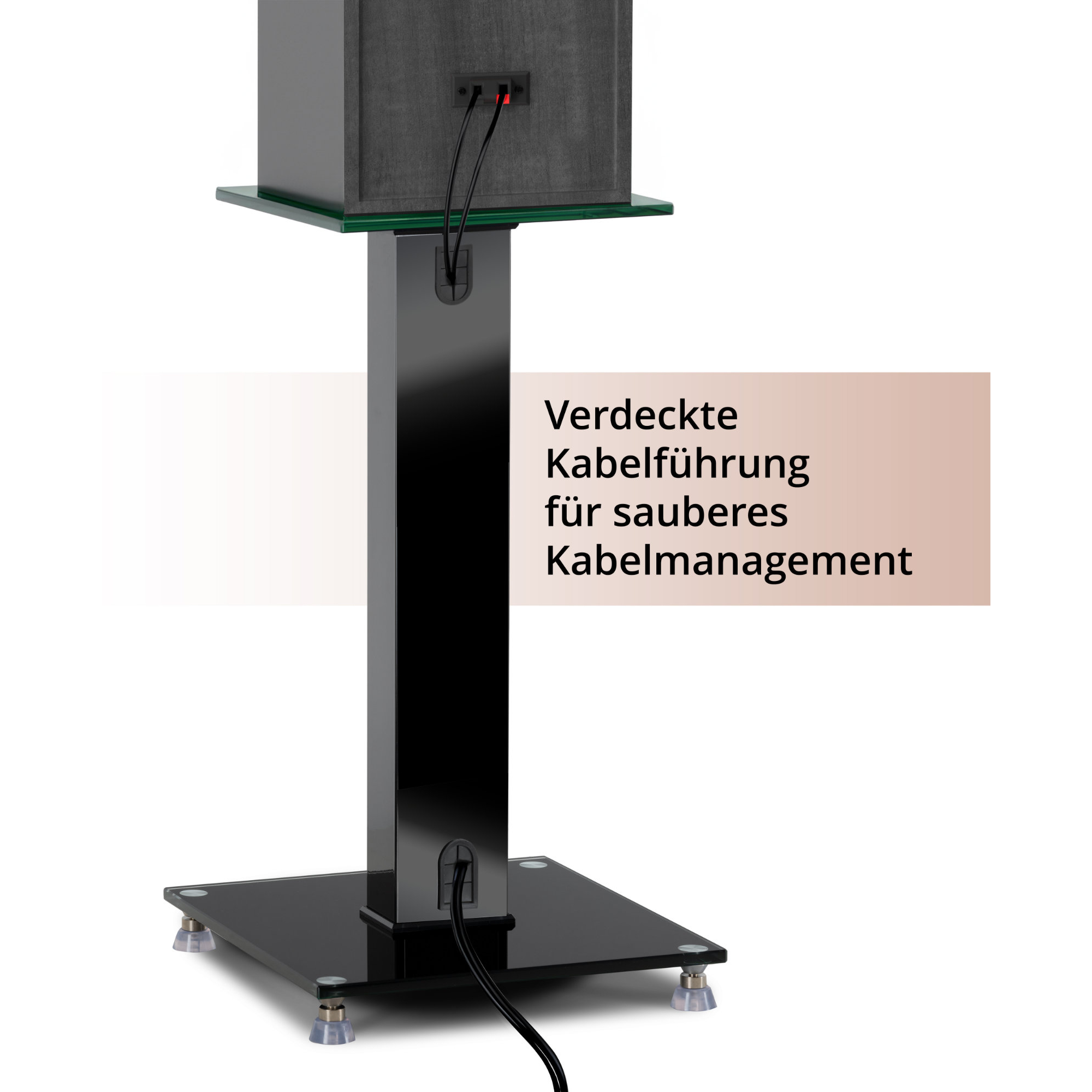 Mit einer Höhe von 46,5cm eignen sich die Pronomic SLS-282 Lautsprecher Stative auch hervorragend in Couchbereichen und Heimkinos. Die Monitorplateus aus ebenfalls schwarzem Glas runden das edle Erscheinungsbild ab. Auf der Rückseite der Standsäule sind zwei Aussparungen angebracht, wodurch man die Lautsprecherkabel dezent im Ständer verschwinden lassen kann.