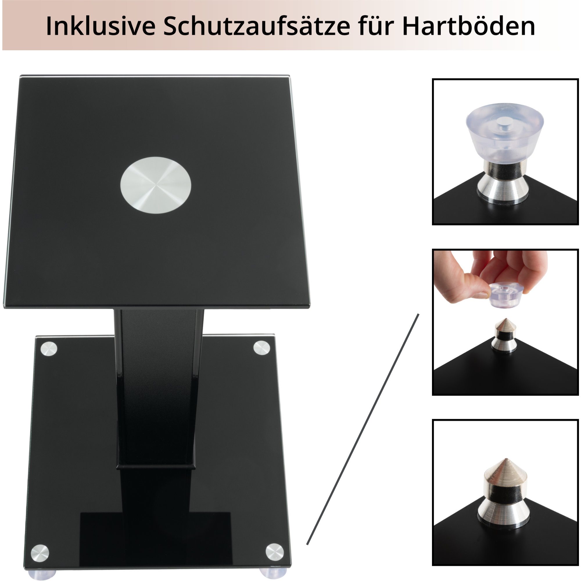 Die höhenverstellbaren Spikes an der Unterseite gleichen nicht nur Bodenunebenheiten aus, sie entkoppeln die Lautsprecherstative vom Boden. Für Teppichböden ist diese Varianten sinnvoll, bei Hartböden wie z.B. Parkett, Laminat und Vinyl bewahren die zusätzlichen Gummikappen Deinen Boden vor eventuellen Kratzern.