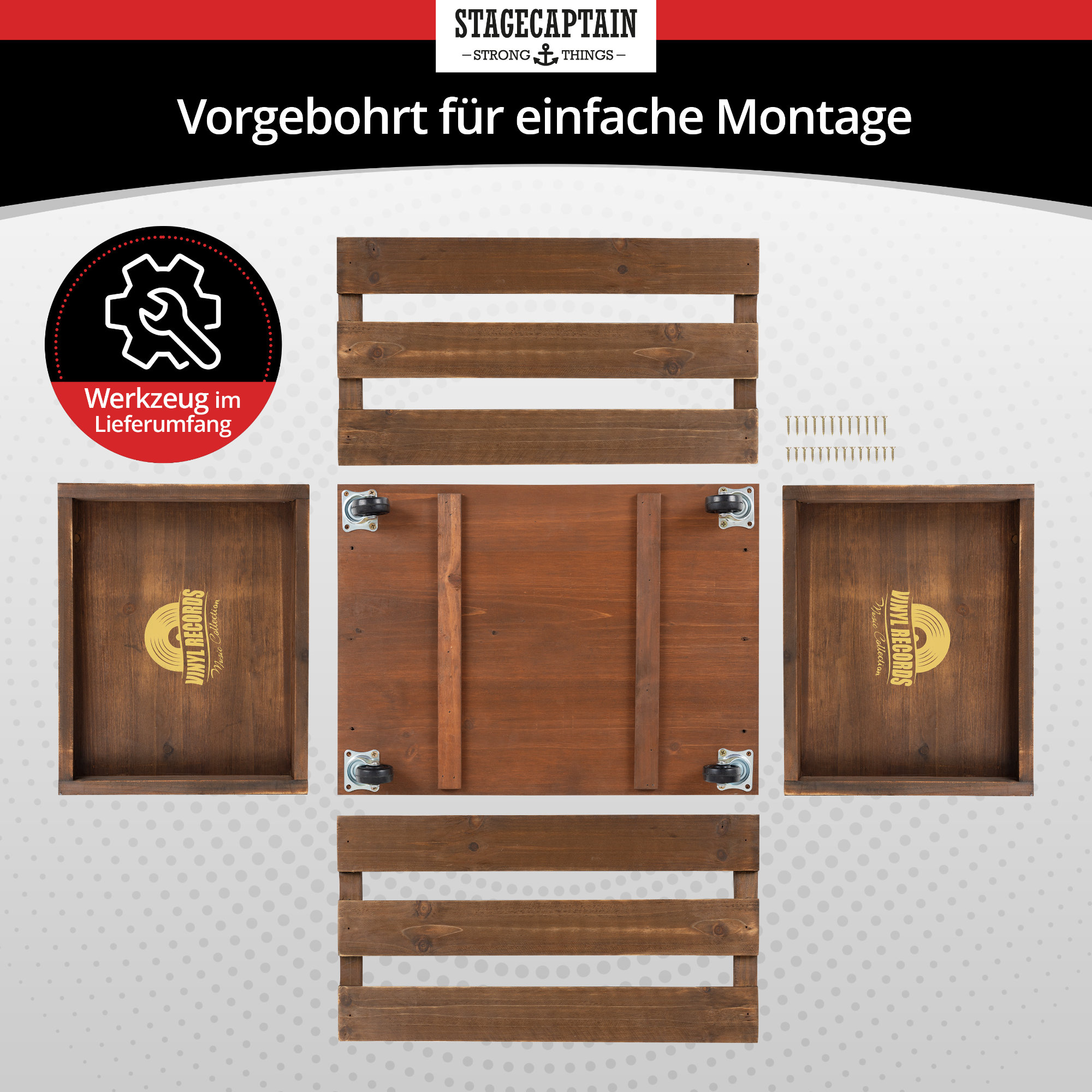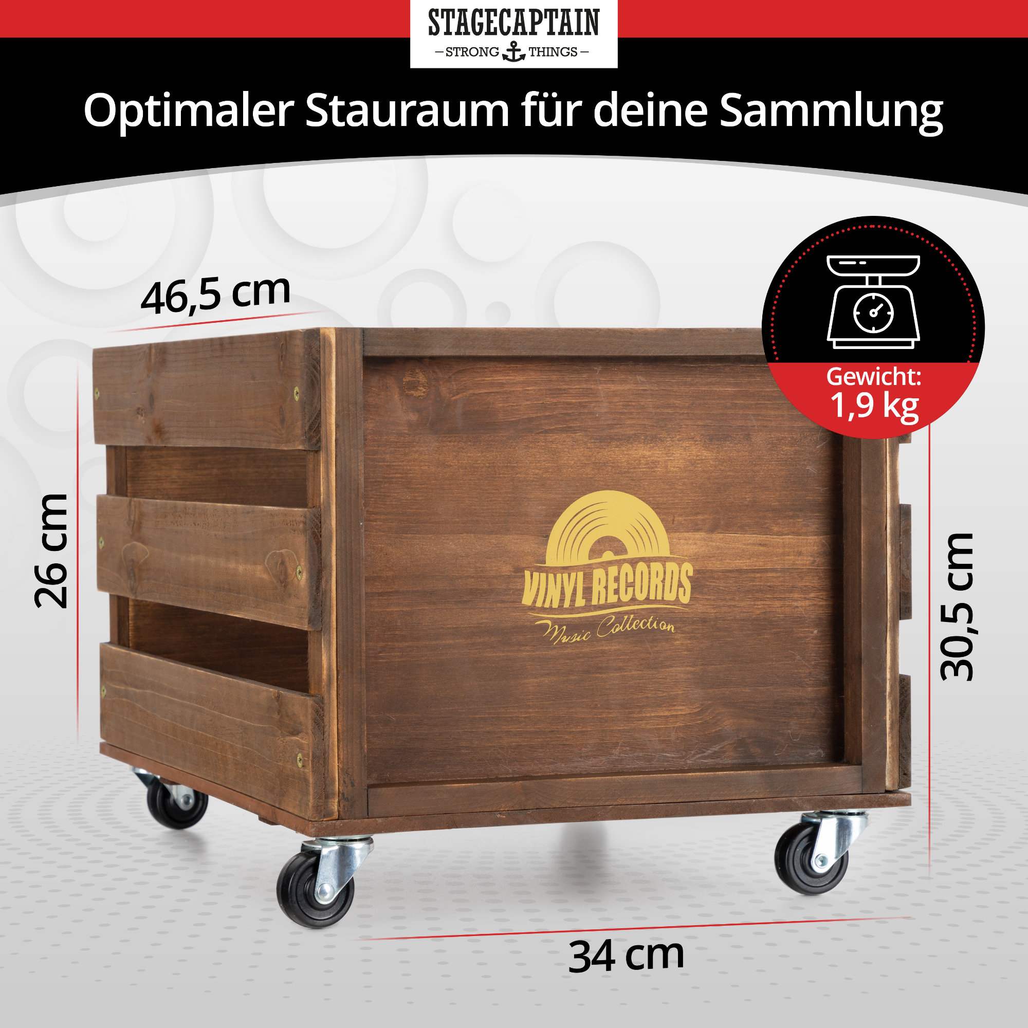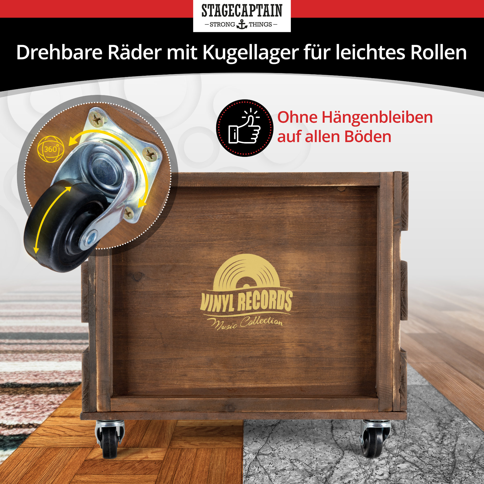 Der "Emil" von Stagecaptain ist die praktische Aufbewahrungskiste für Langspielplatten, Kabel, Zeitschriften oder was auch immer. Mit seinen 4 Lenkrollen ist auch ein schneller Ortswechsel für ihn kein Problem. Denn mit dieser coolen Vintage-Optik sieht er ohnehin überall erstklassig aus.