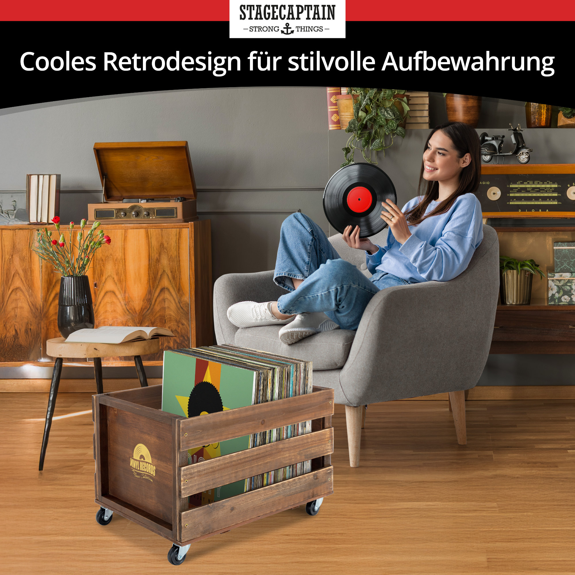 Wo sonst könnte man seine Plattensammlung besser präsentieren als in dieser originellen Box? Der Retro-Look mit stylischen Aufdruck macht im Wohnzimmer eine genau so gute Figur wie im Studio oder am DJ-Pult.