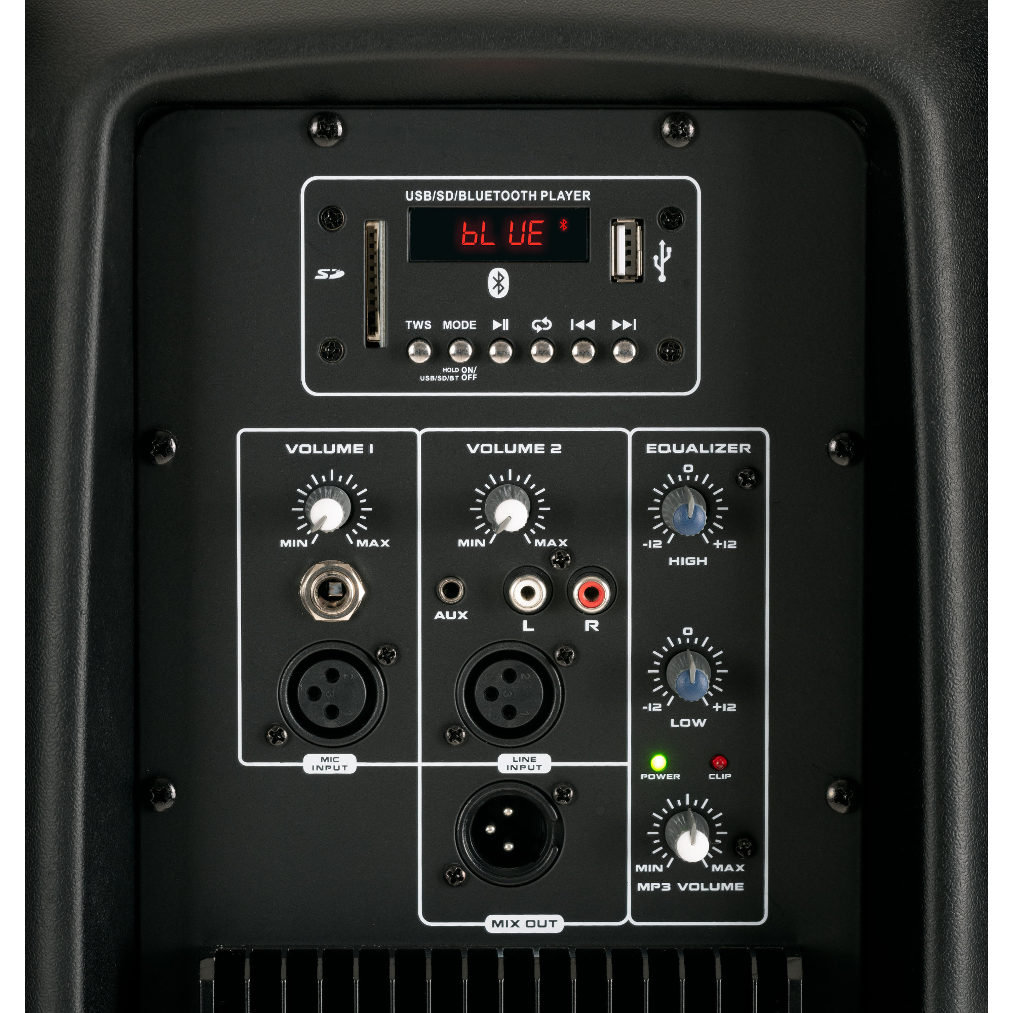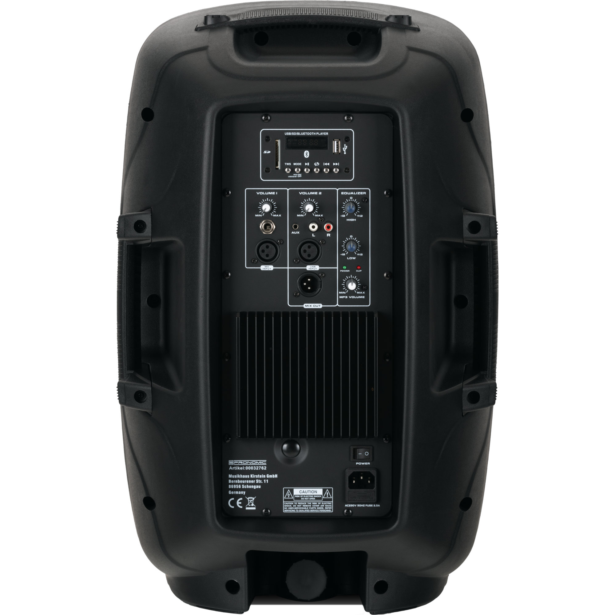 - Anschlüsse: 6,3mm Klinke in, XLR-Mic in, 3,5mm Klinke AUX in, Cinch-Line-Eingang, XLR-Line in, XLR-Mix out