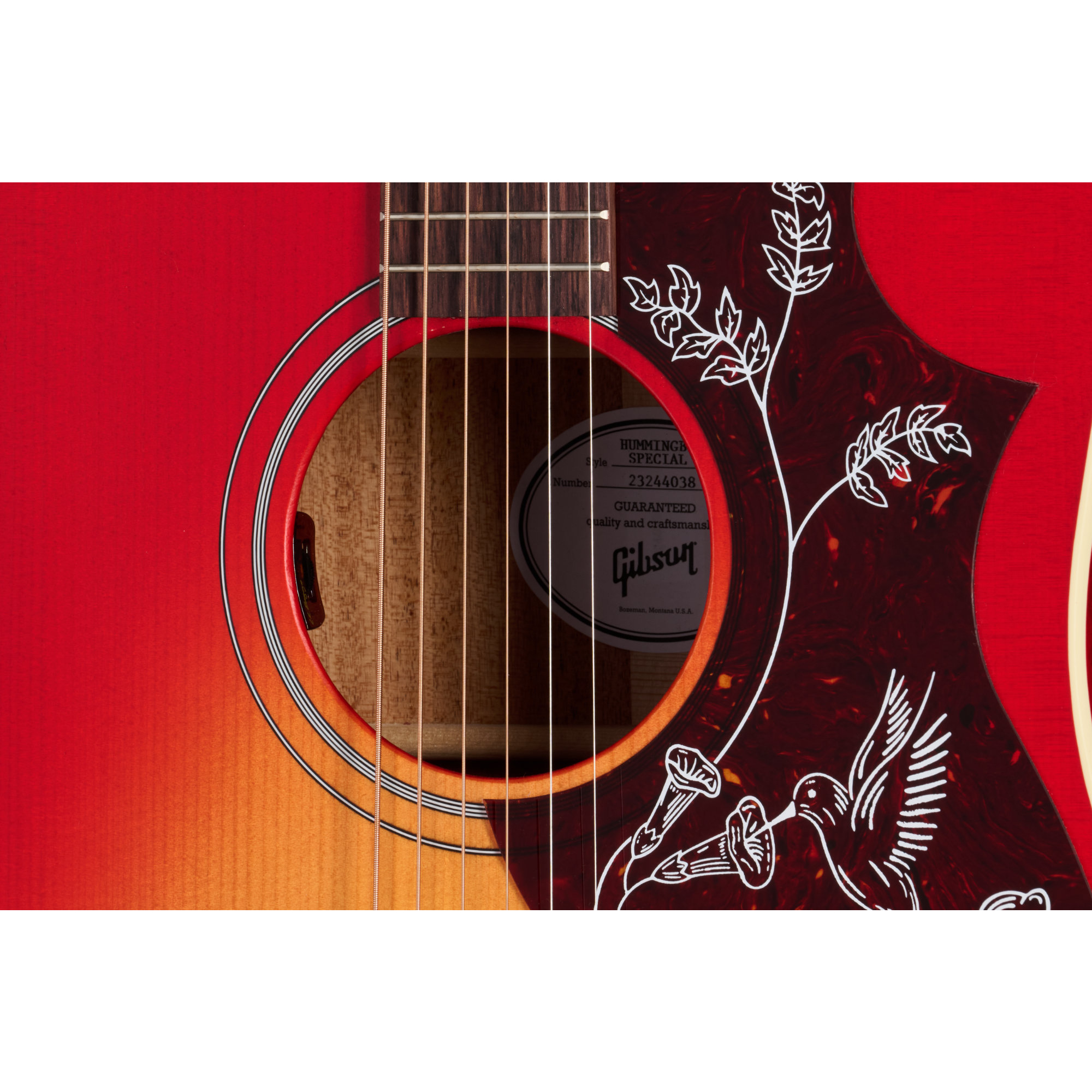 Il manico pratico è fissato al corpo con una giunzione a coda di rondine e, come tutte le acustiche Gibson, è incollato con colla a caldo. Il manico ha un profilo comodo e rotondo, mentre la tastiera in palissandro presenta un raggio da 12" e intarsi parallelogrammi in pearloid, uno dei segni distintivi visivi che rendono la Hummingbird facilmente riconoscibile. La tastiera è dotata di 20 tasti standard. Il ponte tradizionale Belly-up in palissandro monta una selletta TUSQ, così come la sella e i perni ponte. Le meccaniche Grover Rotomatic di alta qualità garantiscono una stabilità di accordatura a prova di bomba. Il battipenna mostra una versione semplificata della celebre grafica Hummingbird. La Hummingbird Special è rifinita con vernice nitrocellulosica satinata nei colori Satin Vintage Cherry Sunburst e Satin Wine Red. È equipaggiata con un pickup piezo L.R. Baggs Element Bronze sotto la selletta e un preamplificatore attivo con controllo volume facilmente accessibile sulla buca, pronta per il palco e lo studio appena tolta dalla custodia imbottita premium inclusa.
