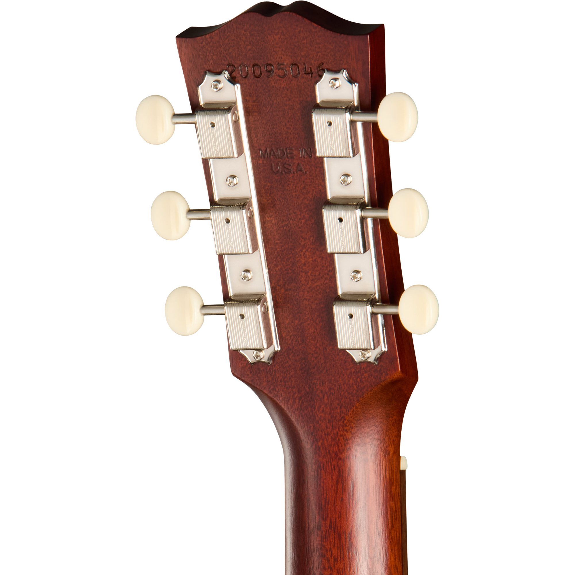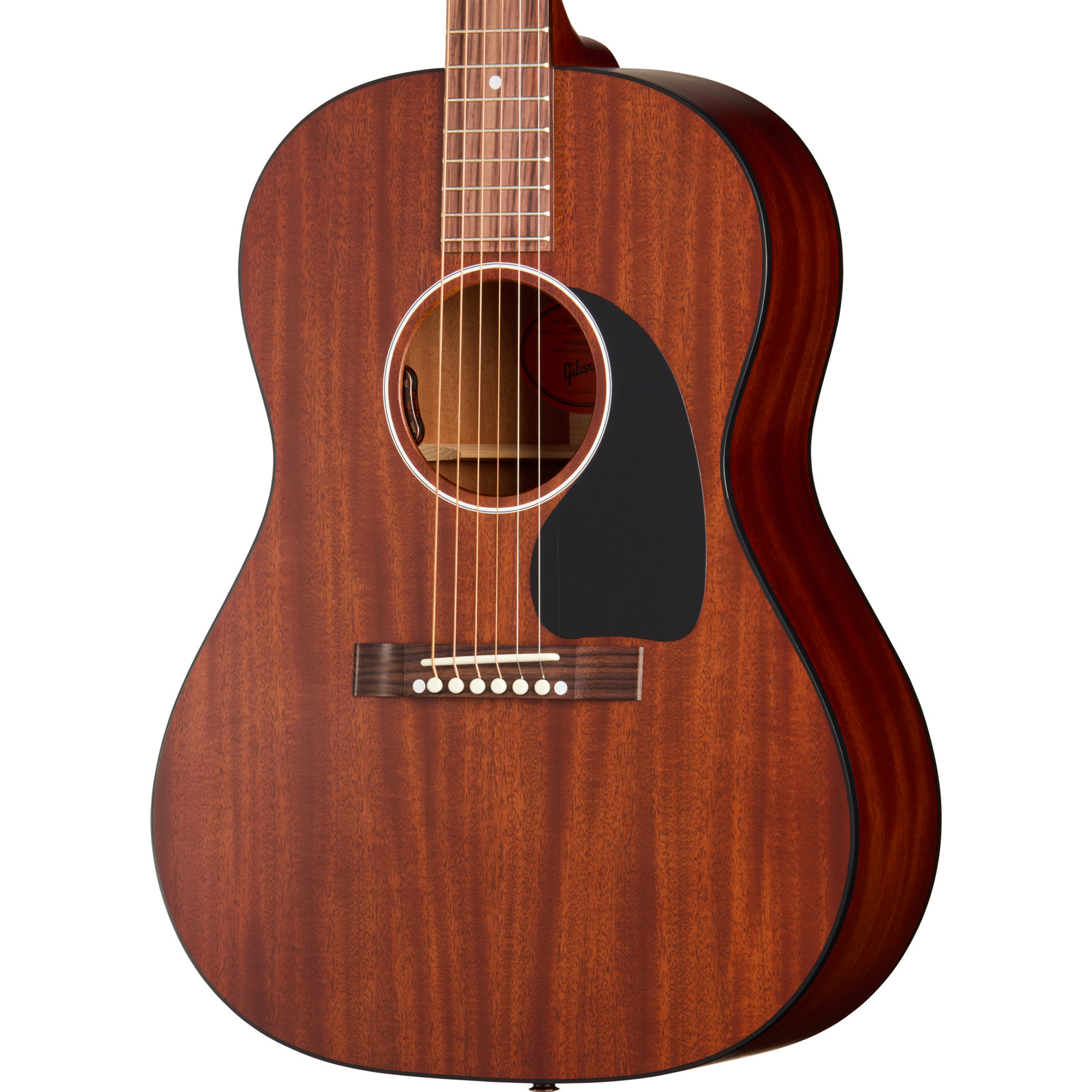 La LG-2 All Mahogany Faded è dotata di un ponte chiuso, smussato e rettangolare in palissandro. Il ponte presenta una selletta in osso mentre i pin del ponte sono in TUSQ. Le meccaniche Grover Strap con pomelli bianchi garantiscono un’ottima stabilità d’accordatura e, insieme al battipenna a goccia, contribuiscono al fascino vintage dello strumento.