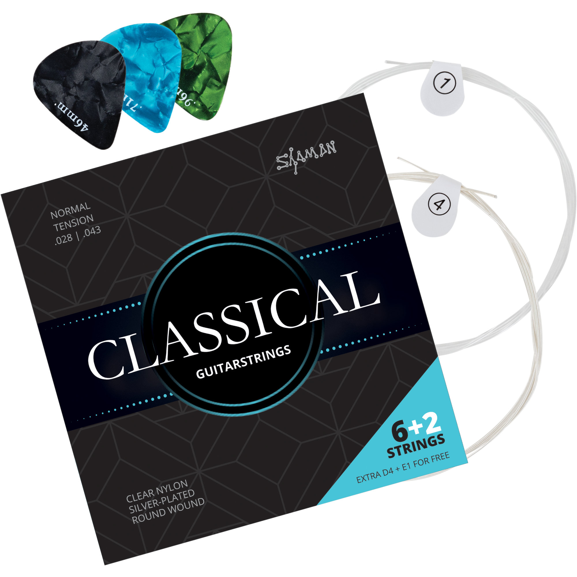 Le corde Shaman per chitarra classica sono state sviluppate da musicisti per musicisti e sono prodotte sotto rigorosi controlli di qualità. Mentre le corde acute sono in nylon trasparente, le corde basse avvolte ricevono una finitura argentata che conferisce un suono incredibilmente brillante. Questo avvolgimento uniforme non solo è molto confortevole per le tue dita, ma riduce notevolmente i rumori di sfregamento. Le corde in misura media classica offrono il perfetto equilibrio tra suono pieno e facilità di suonabilità. Il set completo e le singole corde sono confezionati singolarmente e ogni corda è numerata singolarmente - cambiare le corde è un gioco da ragazzi.