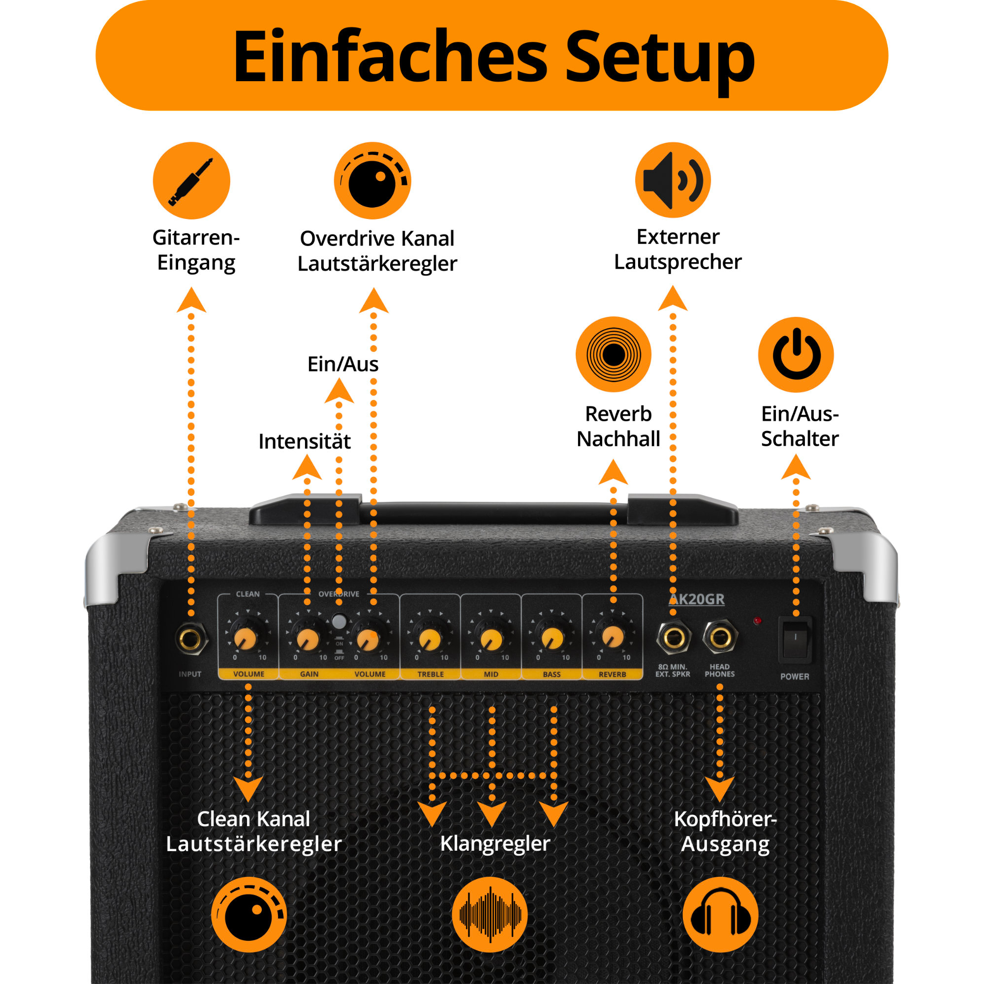 Ridotto all’essenziale, l’AK20GR offre regolazioni chiare e intuitive. Oltre alle prese per la tua chitarra, un altoparlante esterno e le cuffie, ci sono cinque manopole per gain, volume e l’equalizzatore a 3 bande. Con questo puoi adattare rapidamente e facilmente il suono dell’amplificatore ai tuoi gusti personali. Accanto si trova l’interruttore per i due canali del combo: con un semplice clic passi dal canale pulito e chiaro al classico canale distorto o overdrive. Il riverbero integrato (vero riverbero a molla!) può essere miscelato senza gradazioni e dona al tuo suono più profondità e spazialità.