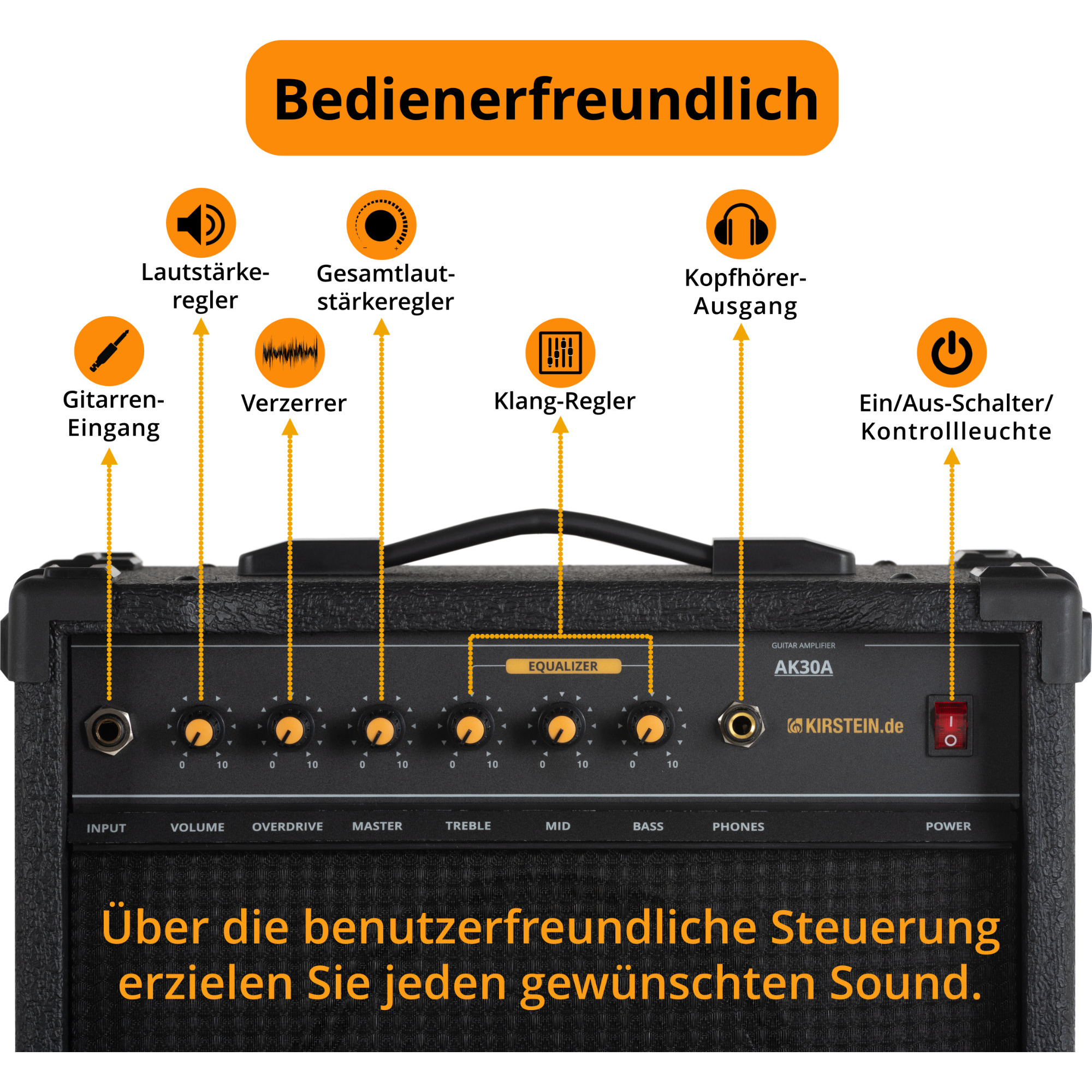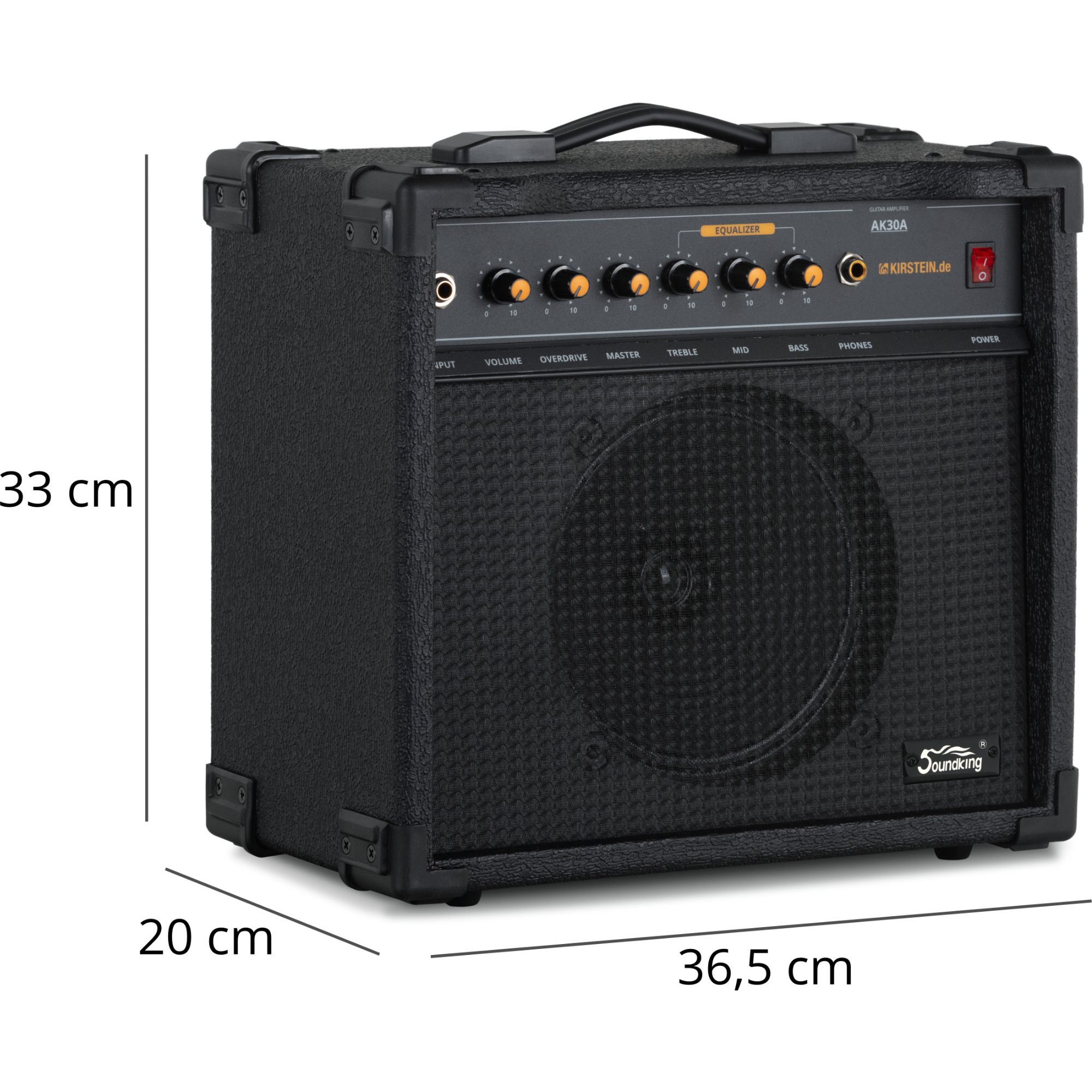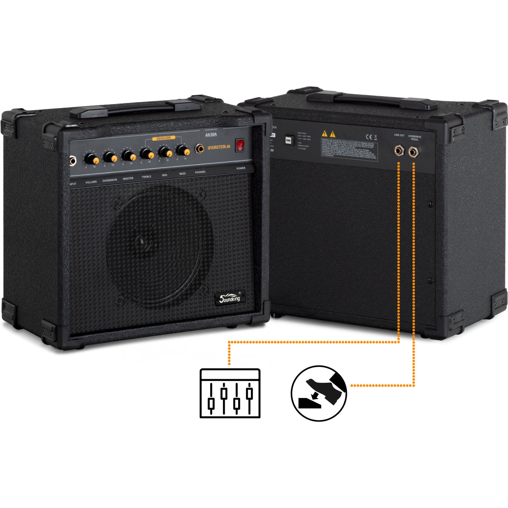 L’AK30A, con i suoi potenti 75 watt, è il modello più potente della serie Soundking AK e rimane comunque un amplificatore per esercitarsi leggero e facile da trasportare con un peso totale di soli 9 kg. Un equalizzatore a 3 bande efficace e la possibilità di passare tra canale clean e distorto assicurano un suono personalizzato e l’adattabilità necessaria a diversi stili. Un punto forte particolarmente professionale del combo chitarra AK30A sono le due connessioni sul retro del robusto cabinet: qui trovi la presa per un pedale opzionale con cui puoi attivare o disattivare comodamente il distorsore integrato anche durante il gioco. E proprio accanto si trova la pratica uscita Line Out, che rende la registrazione della tua chitarra un gioco da ragazzi.