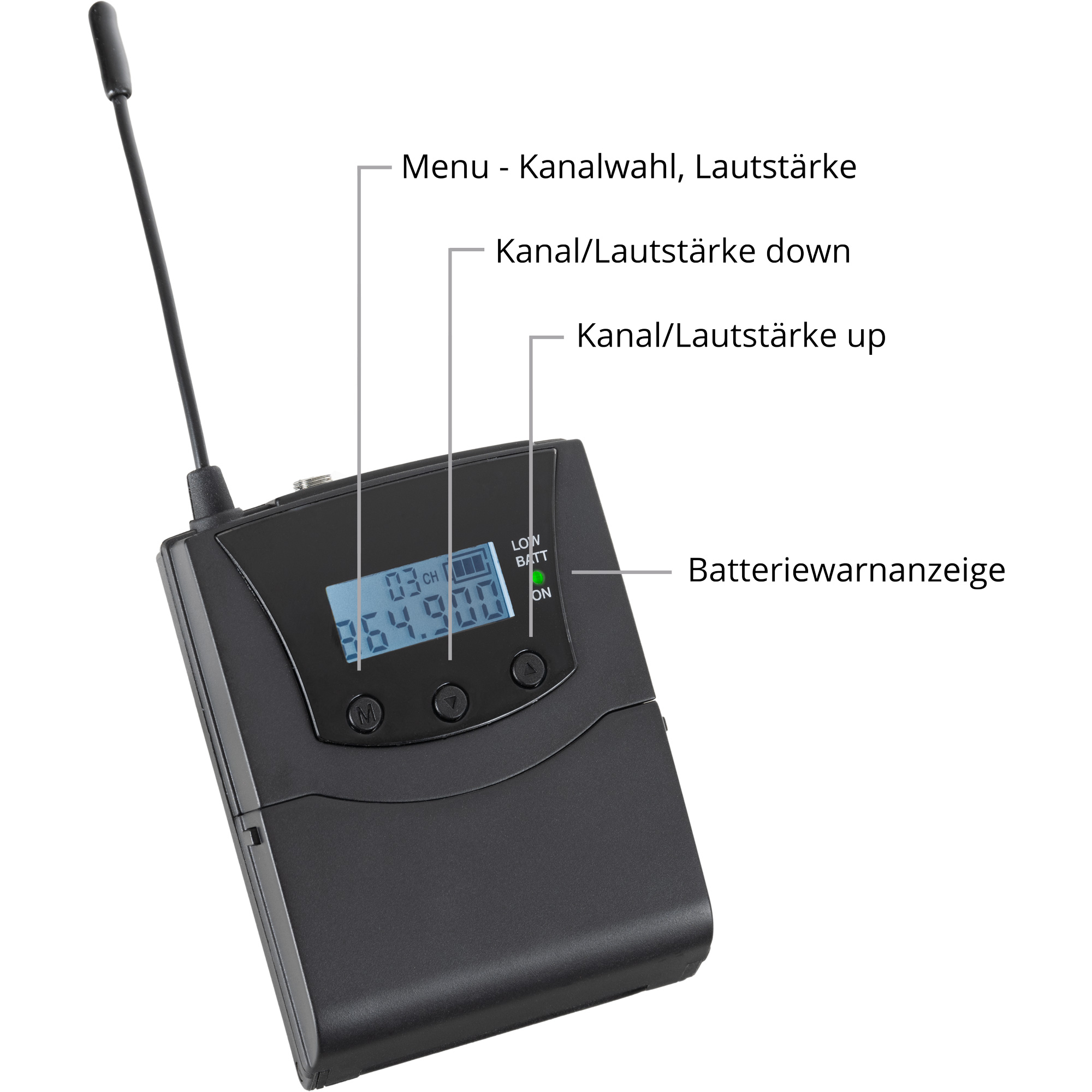 Il microfono dinamico si posiziona facilmente vicino all'orecchio e si collega alla presa jack del trasmettitore. La capsula microfonica è montata su un'asta flessibile lunga 11 cm, che permette una perfetta regolazione. Soprattutto in esterno il paravento offre un ottimo aiuto per garantire una trasmissione vocale chiara in ogni ambiente. Guide turistiche e organizzatori sportivi apprezzano la buona qualità del suono.