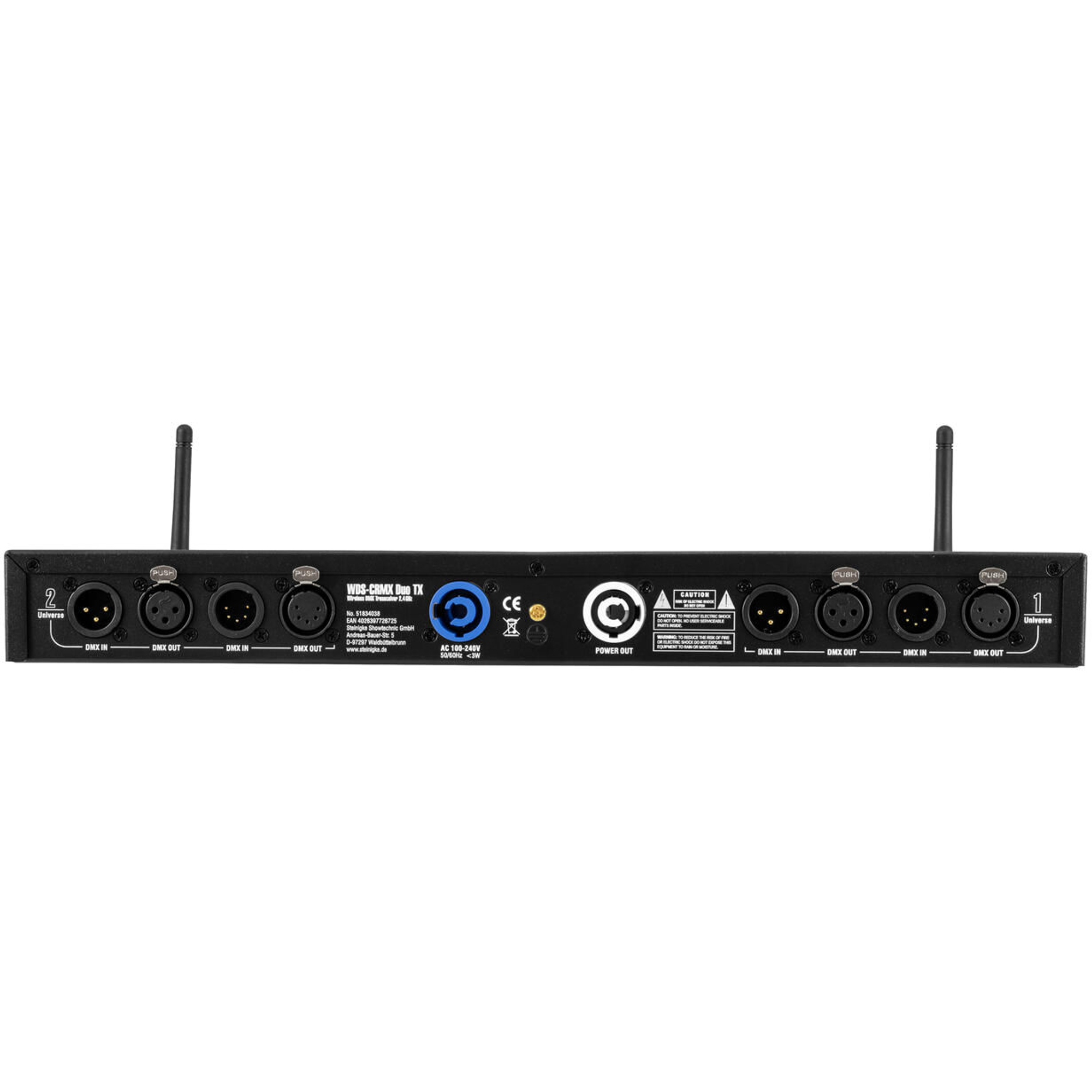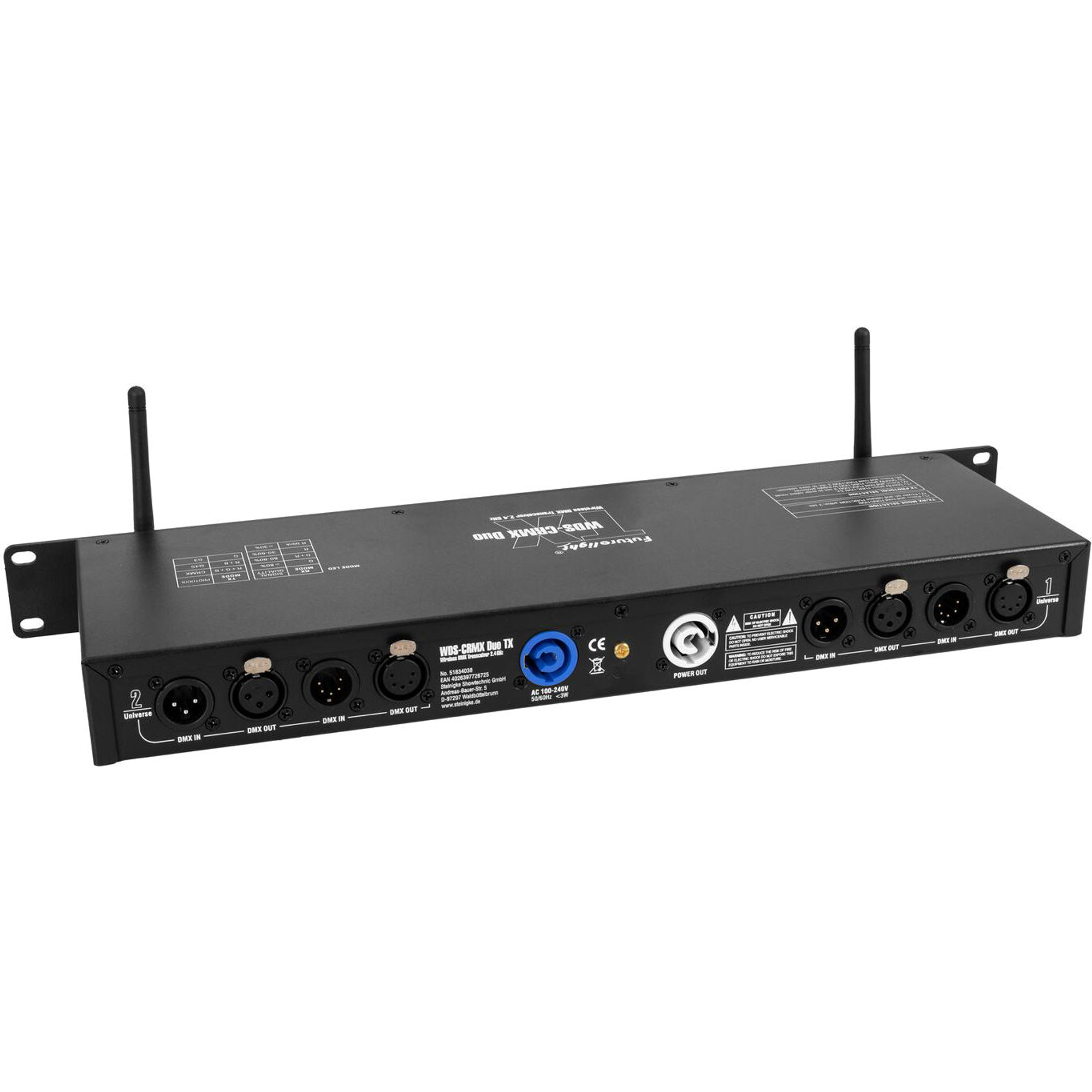 Per integrarsi negli ambienti DMX professionali il Futurelight WDS-CRMX Duo TX dispone di connessioni XLR a 3 e 5 poli per ingresso e uscita. Inoltre l'ingresso di rete e l'uscita di rete facilitano il collegamento in cascata di più unità nel rack o nell'installazione. Il robusto chassis 19" in 1 HE si inserisce perfettamente in rack standard e supporta un cablaggio strutturato e facilmente manutenibile. Con tensione di rete 100 - 240 V AC il dispositivo è utilizzabile a livello internazionale. Chi cerca un'unità rack Wireless DMX professionale con alta compatibilità, funzionamento intuitivo e ottime prestazioni RF troverà qui una soluzione ben pensata per una trasmissione dei dati luci affidabile.