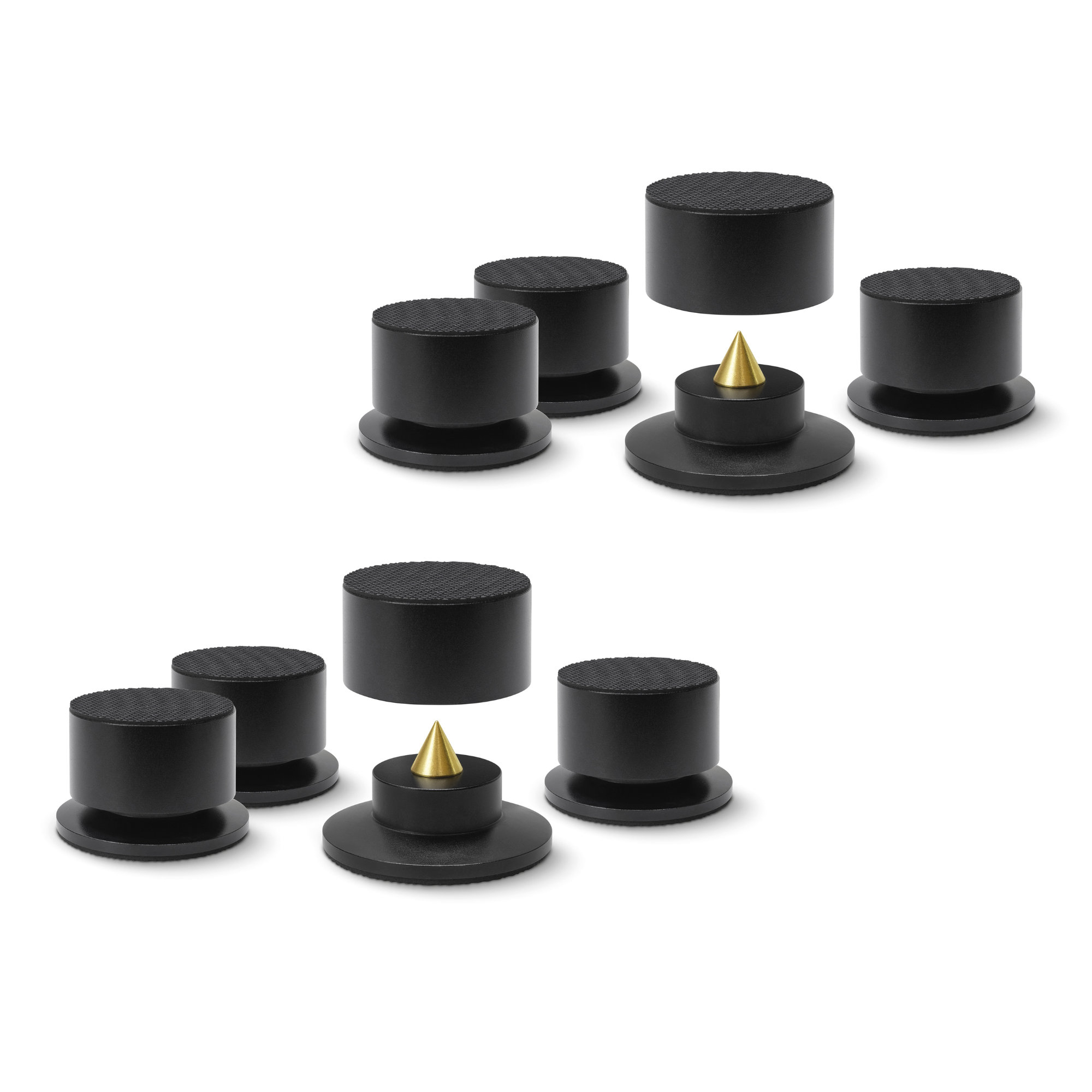 Gli spike avvitati e le boccole di alloggiamento sono realizzati in ottone massiccio, mentre gli altri componenti sono ottenuti da una solida lega di alluminio. Questa combinazione di materiali garantisce un comportamento controllato delle risonanze e conferisce agli assorbitori un aspetto elegante e di alta qualità. La finitura nera con accenti argentati si integra armoniosamente in quasi ogni progetto d'impianto.