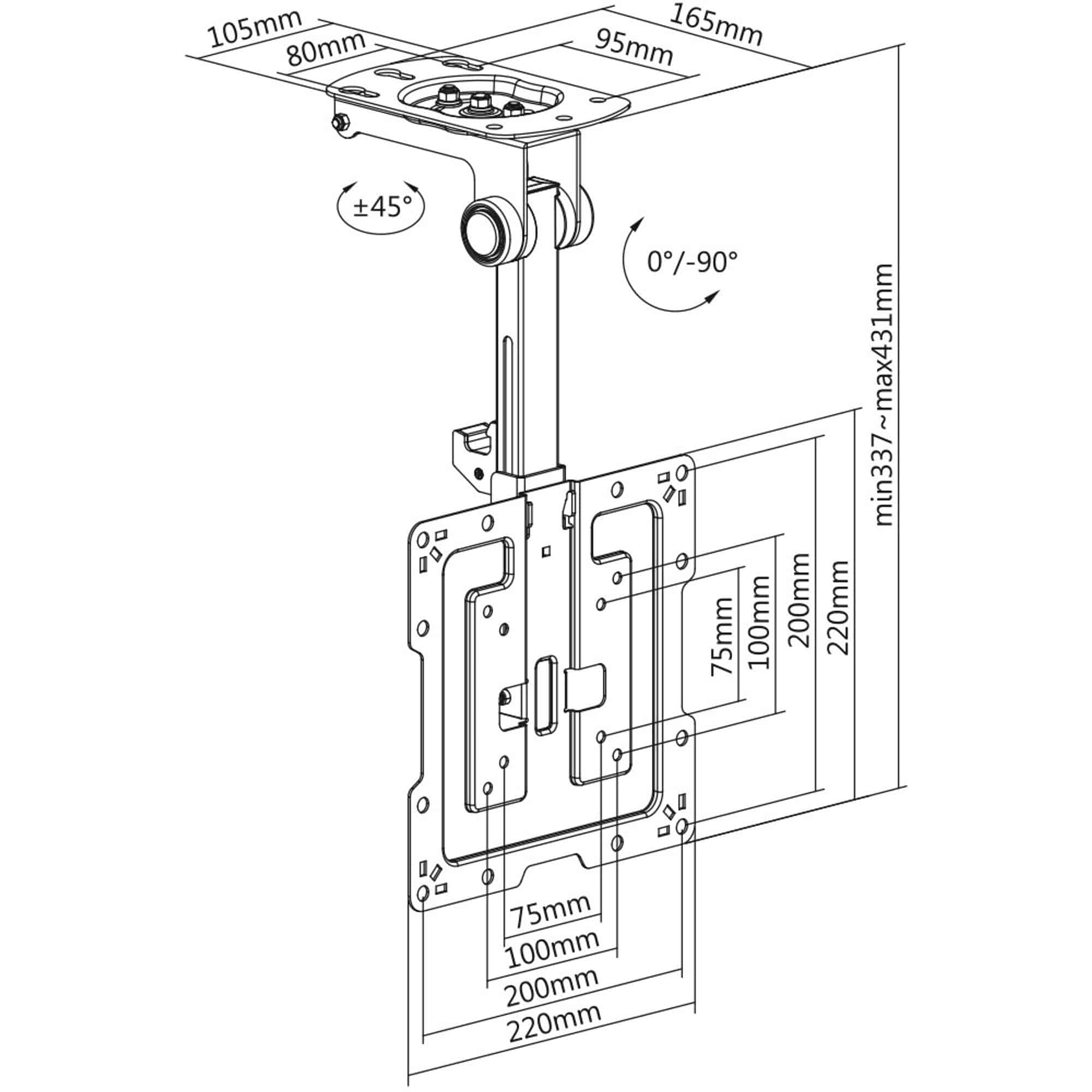 In posizione ripiegata la distanza dal soffitto è di soli 8,5 cm, rendendo il supporto molto discreto e salvaspazio. Quando è aperto la distanza dal soffitto è regolabile tra 337 e 431 mm - perfetto se hai soffitti più alti o diverse situazioni di montaggio.