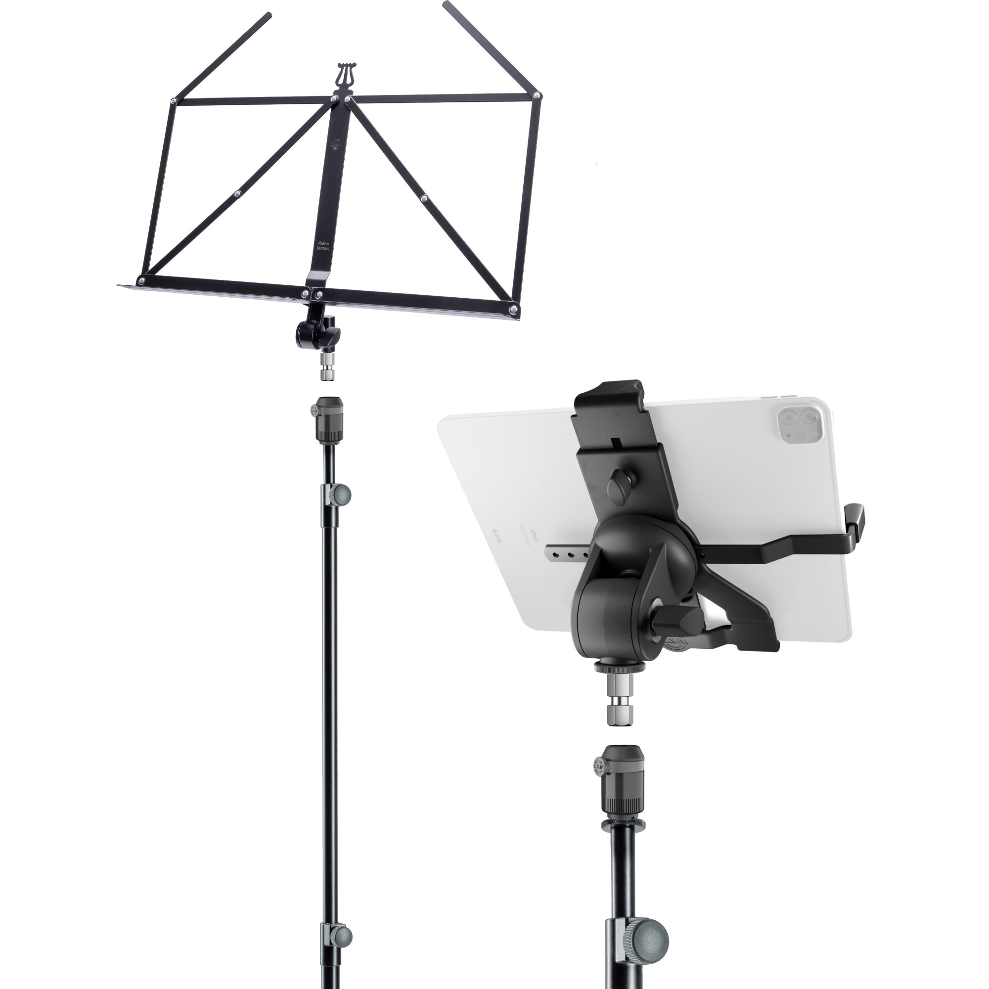 Sullo stativo, con una pressione del pulsante sull'adattatore Quick Release, è possibile rimuovere o fissare a scelta la testa per leggio o il supporto tablet - a seconda che in orchestra si suoni da fogli manoscritti o che gli spartiti siano disponibili digitalmente sul tablet. Il supporto tablet tiene il dispositivo saldamente: le situazioni "traballanti" in cui il tablet viene appoggiato senza protezione su leggi normali appartengono così al passato.