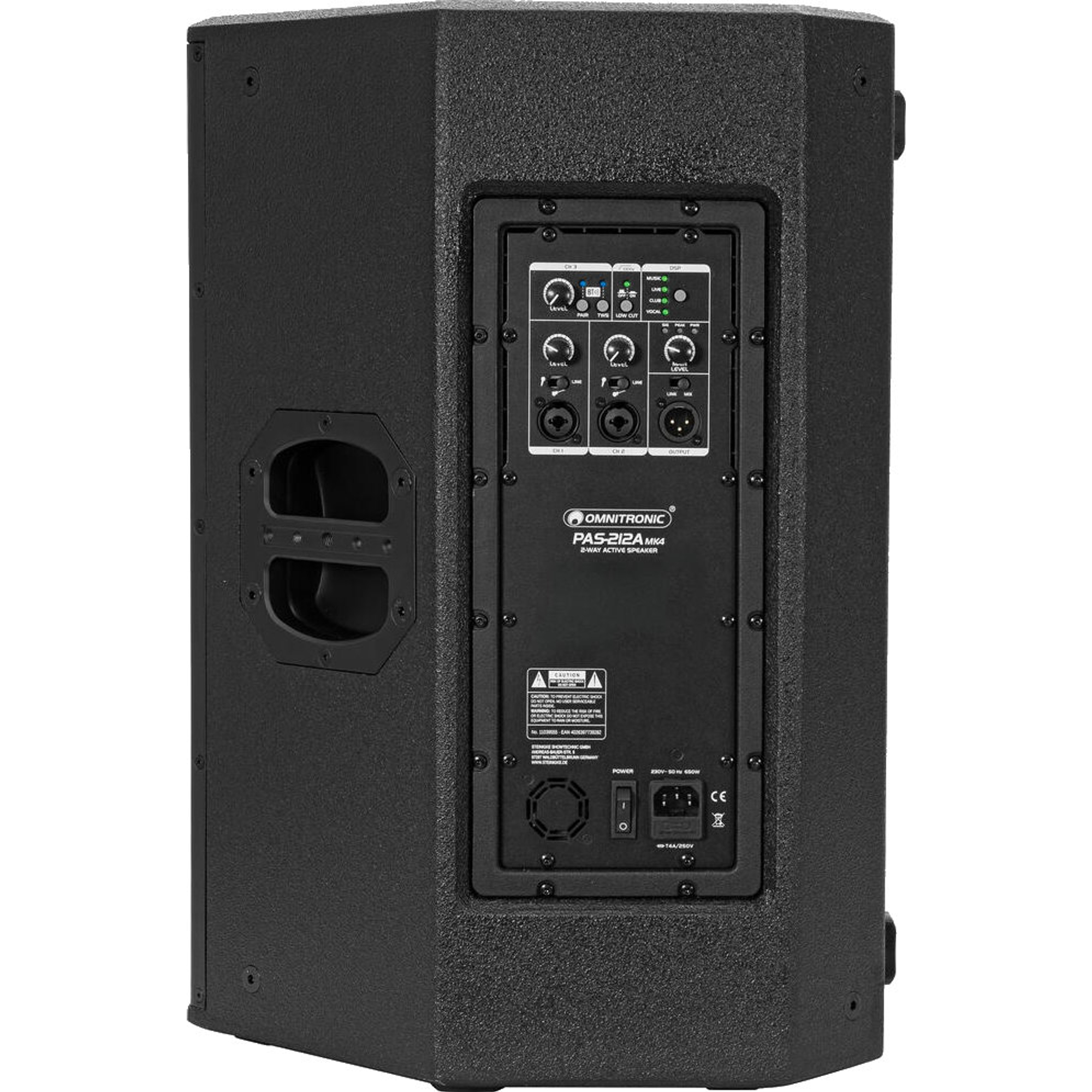 Con l'Omnitronic PAS-212A MK4 ottieni un diffusore PA attivo a 2 vie professionale, che convince per la sua costruzione di alta qualità e l'equipaggiamento versatile. Il cabinet trapezoidale in multistrato con inclinazione monitor ti permette un posizionamento flessibile - in piedi, sospeso o come monitor da palco. La combinazione di griglia metallica robusta con schiuma acustica, maniglie resistenti, doppia flangia e numerosi punti di sospensione garantisce sicurezza e flessibilità durante montaggio e trasporto. L'amplificatore Class D biamp integrato eroga un suono potente, mentre il DSP con diversi preset permette una rapida adattazione timbrica per MUSIC, LIVE, CLUB o VOICE. La funzione Stereo-Bluetooth con Stereo-Link consente di collegare due sistemi senza fili — ideale per DJ mobili, organizzatori o band che apprezzano un allestimento rapido e con pochi cavi.
